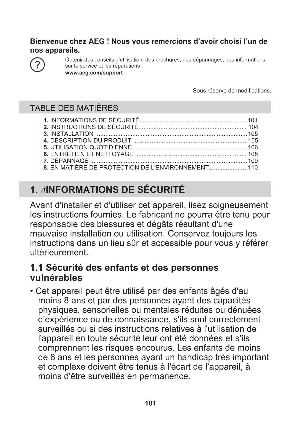 - Cet appareil peut être utilisé par des enfants âgés d'au moins 8 ans et par des personnes ayant des capacités physiques, sensorielles ou mentales réduites ou dénuées d’expérience ou de connaissance, s'ils sont correctement surveillés ou si des instructions relatives à l'utilisation de l'appareil en toute sécurité leur ont été données et s’ils comprennent les risques encourus. Les enfants de moins de 8 ans et les personnes ayant un handicap très important et complexe doivent être tenus à l'écart de l’appareil, à moins d'être surveillés en permanence. 101• Veillez à ce que les enfants ne jouent pas avec l’appareil.