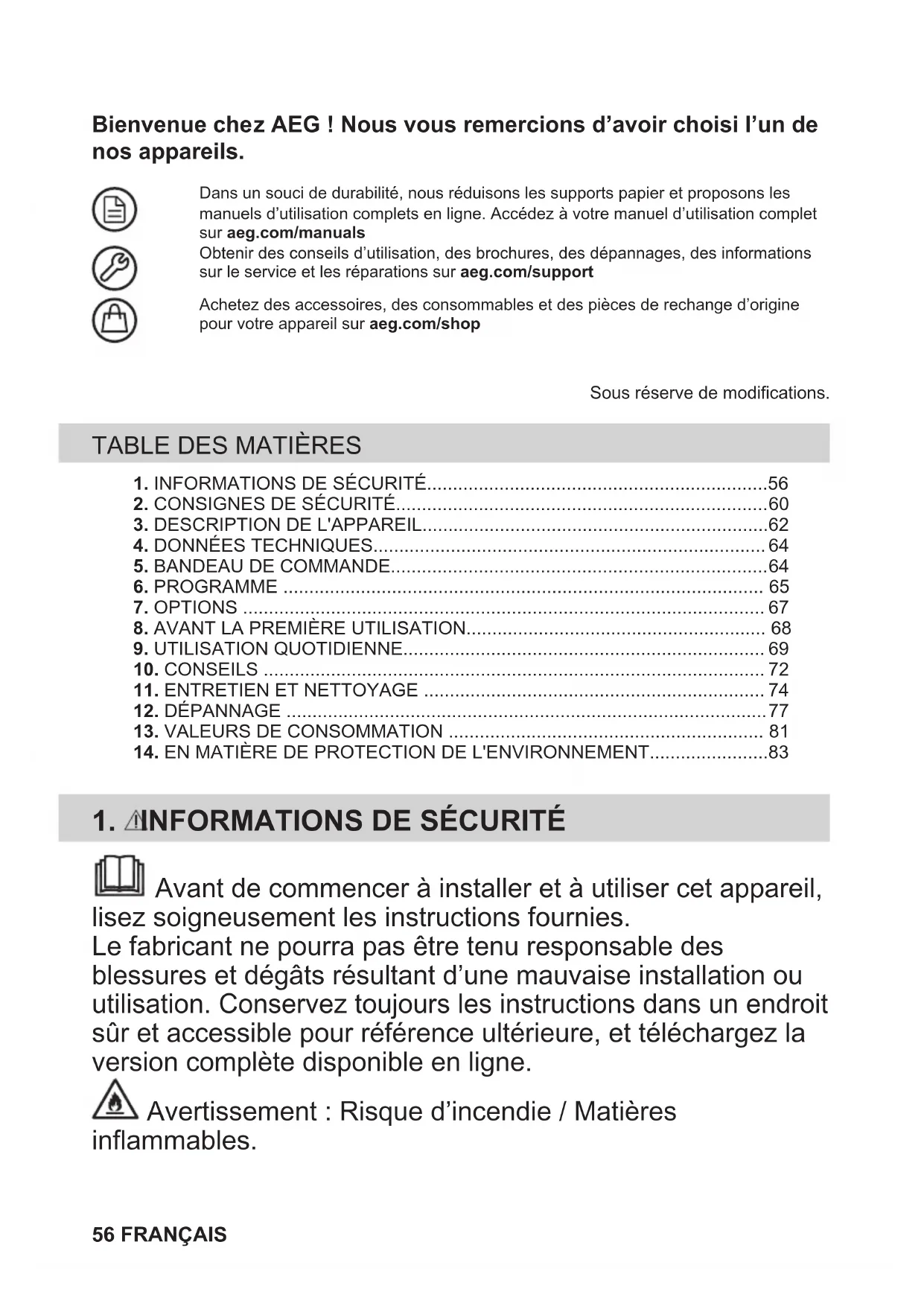 Recycle materials with the symbol . Put the packaging in relevant containers to recycle it. Help protect the environment and human health by recycling waste of electrical and electronic appliances. Do not dispose of appliances marked with the symbol with the household waste. Return the product to your local recycling facility or contact your municipal office. ENGLISH 55Bienvenue chez AEG ! Nous vous remercions d’avoir choisi l’un de nos appareils. Dans un souci de durabilité, nous réduisons les supports papier et proposons lesmanuels d’utilisation complets en ligne. Accédez à votre manuel d’utilisation completsur aeg.com/manualsObtenir des conseils d’utilisation, des brochures, des dépannages, des informationssur le service et les réparations sur aeg.com/supportAchetez des accessoires, des consommables et des pièces de rechange d’originepour votre appareil sur aeg.com/shopSous réserve de modifications.