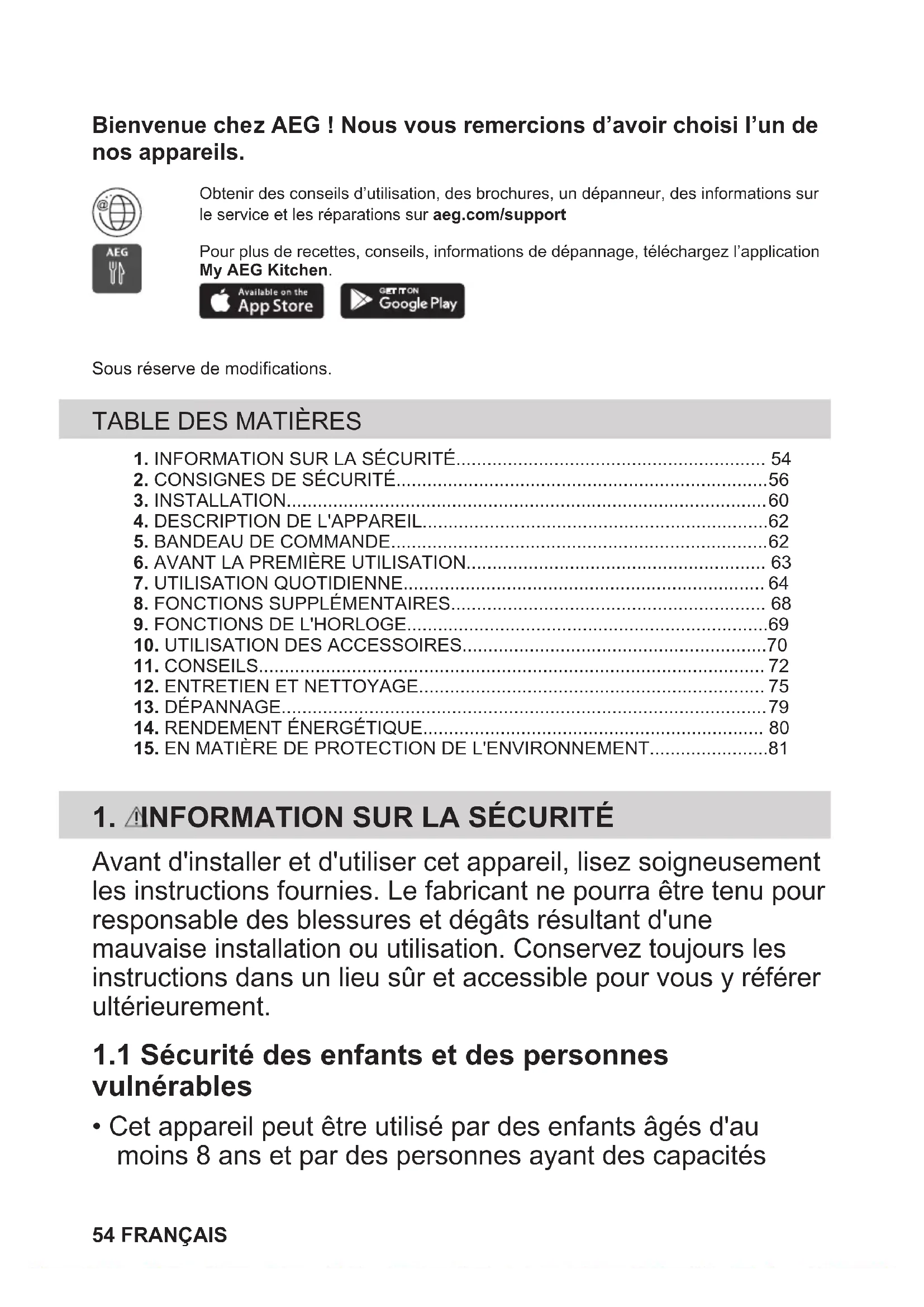 Recyclez les matériaux portant le symbole . Déposez les emballages dans les conteneurs prévus à cet effet. Contribuez à la protection de l'environnement et à votre sécurité, recyclez vos produits électriques et électroniques. Ne jetez pas les appareils portant le symbole avec les ordures ménagères. Emmenez un tel produit dans votre centre local de recyclage ou contactez vos services municipaux. Concerne la France uniquement : FRANÇAIS 81Willkommen bei AEG! Danke, dass du dich für unser Gerät entschieden hast. Hole dir Anwendungshinweise, Prospekte, Fehlerbehebungs-, Service- undReparatur-Informationen unter aeg.com/support.Für weitere Rezepte, Tipps und Fehlerbehebung lade die App My AEG Kitchenherunter.Änderungen vorbehalten. INHALTSVERZEICHNIS