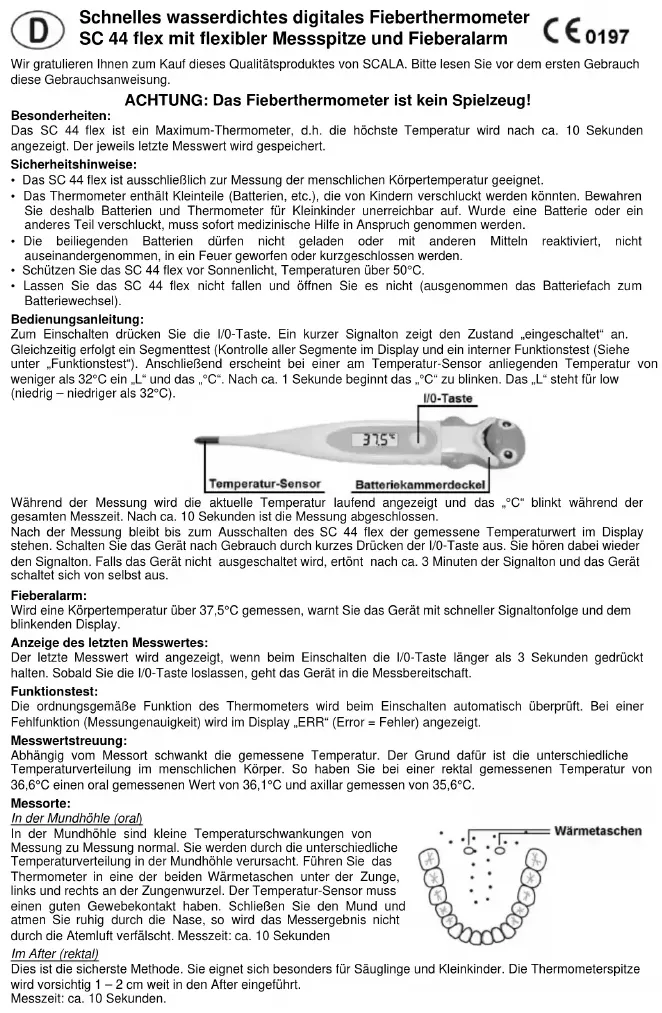 Importör: SCALA Electronic GmbH, Ruhlsdorfer Str. 95 14532 Stahnsdorf/Germany www.scala-electronic.de Rev. 04/05/2020/SELe thermomètre à mesure rapide SC 44 flex avec une pointe de mesure flexible et alarme à la fièvre Nous vous félicitons pour l’achat de ce produit de qualité de la société Scala. Veuillez lire ce mode d’emploi avant le premier mode d’emploi. ATTENTION: Le thermomètre n'est pas un jouet! Particularités: Le SC 44 flex est un thermomètre à maximum, cela signifie que la température la plus élevée est déjà affichée après 10 secondes. La dernière valeur de mesure est à chaque fois mémorisée. Informations de sécurité: