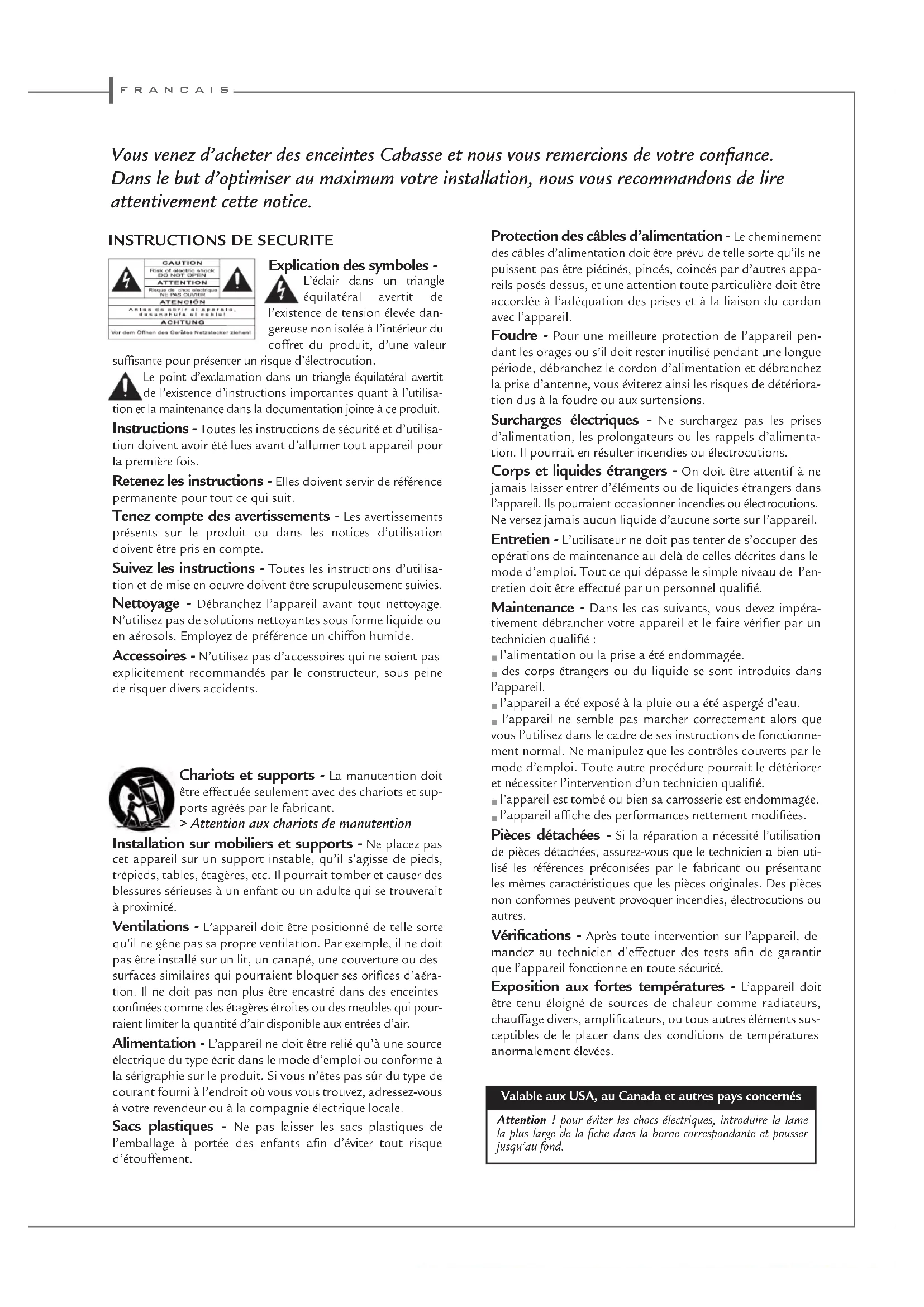 Lautsprecher deaktiviert werden sollen. CAB Notice ZEF 13-17-TR.indd 4 21/03/13 17:56f r a n c a i s Vous venez d’acheter des enceintes Cabasse et nous vous remercions de votre confiance. Dans le but d’optimiser au maximum votre installation, nous vous recommandons de lire attentivement cette notice. Explication des symboles - L’éclair dans un triangle équilatéral avertit de l’existence de tension élevée dan-gereuse non isolée à l’intérieur du coffret du produit, d’une valeur suffisante pour présenter un risque d’électrocution.Le point d’exclamation dans un triangle équilatéral avertit de l’existence d’instructions importantes quant à l’utilisa-tion et la maintenance dans la documentation jointe à ce produit. Instructions - Toutes les instructions de sécurité et d’utilisa- tion doivent avoir été lues avant d’allumer tout appareil pour la première fois. Retenez les instructions - Elles doivent servir de référence permanente pour tout ce qui suit. Tenez compte des avertissements - Les avertissements présents sur le produit ou dans les notices d’utilisation doivent être pris en compte. Suivez les instructions - Toutes les instructions d’utilisa- tion et de mise en oeuvre doivent être scrupuleusement suivies. Nettoyage - Débranchez l’appareil avant tout nettoyage. N’utilisez pas de solutions nettoyantes sous forme liquide ouen aérosols. Employez de préférence un chiffon humide. Accessoires - N’utilisez pas d’accessoires qui ne soient pas explicitement recommandés par le constructeur, sous peine de risquer divers accidents. Chariots et supports - La manutention doit être effectuée seulement avec des chariots et sup-ports agréés par le fabricant. > Attention aux chariots de manutention Installation sur mobiliers et supports - Ne placez pas cet appareil sur un support instable, qu’il s’agisse de pieds, trépieds, tables, étagères, etc. Il pourrait tomber et causer des blessures sérieuses à un enfant ou un adulte qui se trouverait à proximité. Ventilations - L’appareil doit être positionné de telle sorte qu’il ne gêne pas sa propre ventilation. Par exemple, il ne doit pas être installé sur un lit, un canapé, une couverture ou dessurfaces similaires qui pourraient bloquer ses orifices d’aéra-tion. Il ne doit pas non plus être encastré dans des enceintes confinées comme des étagères étroites ou des meubles qui pour-raient limiter la quantité d’air disponible aux entrées d’air. Alimentation - L’appareil ne doit être relié qu’à une source électrique du type écrit dans le mode d’emploi ou conforme à la sérigraphie sur le produit. Si vous n’êtes pas sûr du type de courant fourni à l’endroit où vous vous trouvez, adressez-vous à votre revendeur ou à la compagnie électrique locale. Sacs plastiques - Ne pas laisser les sacs plastiques de l’emballage à portée des enfants afin d’éviter tout risque d’étouffement. Protection des câbles d’alimentation - Le cheminement des câbles d’alimentation doit être prévu de telle sorte qu’ils ne puissent pas être piétinés, pincés, coincés par d’autres appa-reils posés dessus, et une attention toute particulière doit être accordée à l’adéquation des prises et à la liaison du cordon avec l’appareil. Foudre - Pour une meilleure protection de l’appareil pen- dant les orages ou s’il doit rester inutilisé pendant une longue période, débranchez le cordon d’alimentation et débranchez la prise d’antenne, vous éviterez ainsi les risques de détériora-tion dus à la foudre ou aux surtensions. Surcharges électriques - Ne surchargez pas les prises d’alimentation, les prolongateurs ou les rappels d’alimenta-tion. Il pourrait en résulter incendies ou électrocutions. Corps et liquides étrangers - On doit être attentif à ne jamais laisser entrer d’éléments ou de liquides étrangers dansl’appareil. Ils pourraient occasionner incendies ou électrocutions.Ne versez jamais aucun liquide d’aucune sorte sur l’appareil. Entretien - L’utilisateur ne doit pas tenter de s’occuper des opérations de maintenance au-delà de celles décrites dans lemode d’emploi. Tout ce qui dépasse le simple niveau de l’en-tretien doit être effectué par un personnel qualifié. Maintenance - Dans les cas suivants, vous devez impéra- tivement débrancher votre appareil et le faire vérifier par un technicien qualifié : l’alimentation ou la prise a été endommagée. des corps étrangers ou du liquide se sont introduits dans l’appareil. l’appareil a été exposé à la pluie ou a été aspergé d’eau. l’appareil ne semble pas marcher correctement alors que vous l’utilisez dans le cadre de ses instructions de fonctionne-ment normal. Ne manipulez que les contrôles couverts par le mode d’emploi. Toute autre procédure pourrait le détériorer et nécessiter l’intervention d’un technicien qualifié. l’appareil est tombé ou bien sa carrosserie est endommagée. l’appareil affiche des performances nettement modifiées. Pièces détachées - Si la réparation a nécessité l’utilisation de pièces détachées, assurez-vous que le technicien a bien uti-lisé les références préconisées par le fabricant ou présentant les mêmes caractéristiques que les pièces originales. Des pièces non conformes peuvent provoquer incendies, électrocutions ou autres. Vérifications - Après toute intervention sur l’appareil, de- mandez au technicien d’effectuer des tests afin de garantir que l’appareil fonctionne en toute sécurité. Exposition aux fortes températures - L’appareil doit être tenu éloigné de sources de chaleur comme radiateurs, chauffage divers, amplificateurs, ou tous autres éléments sus-ceptibles de le placer dans des conditions de températures anormalement élevées.Valable aux USA, au Canada et autres pays concernésAttention ! pour éviter les chocs électriques, intr