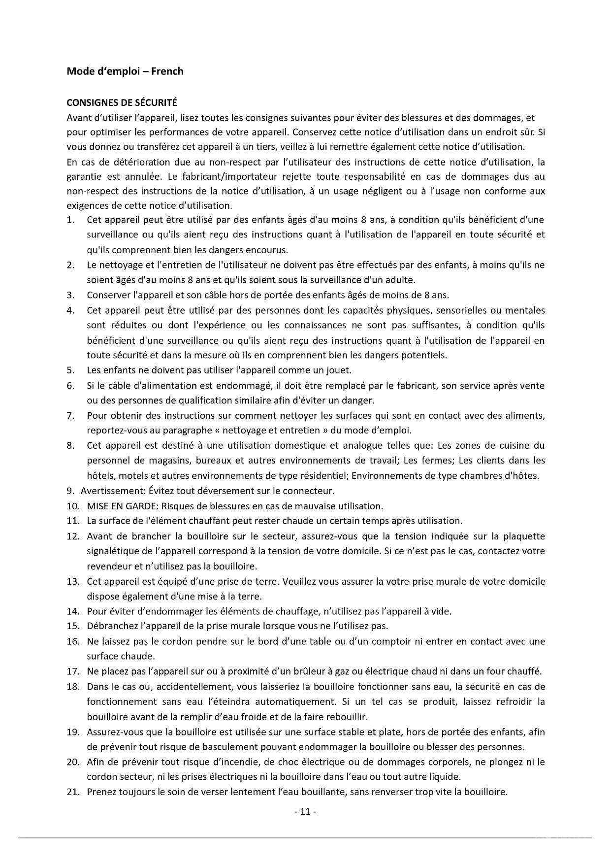 19. Assurez-vous que la bouilloire est utilisée sur une surface stable et plate, hors de portée des enfants, afin