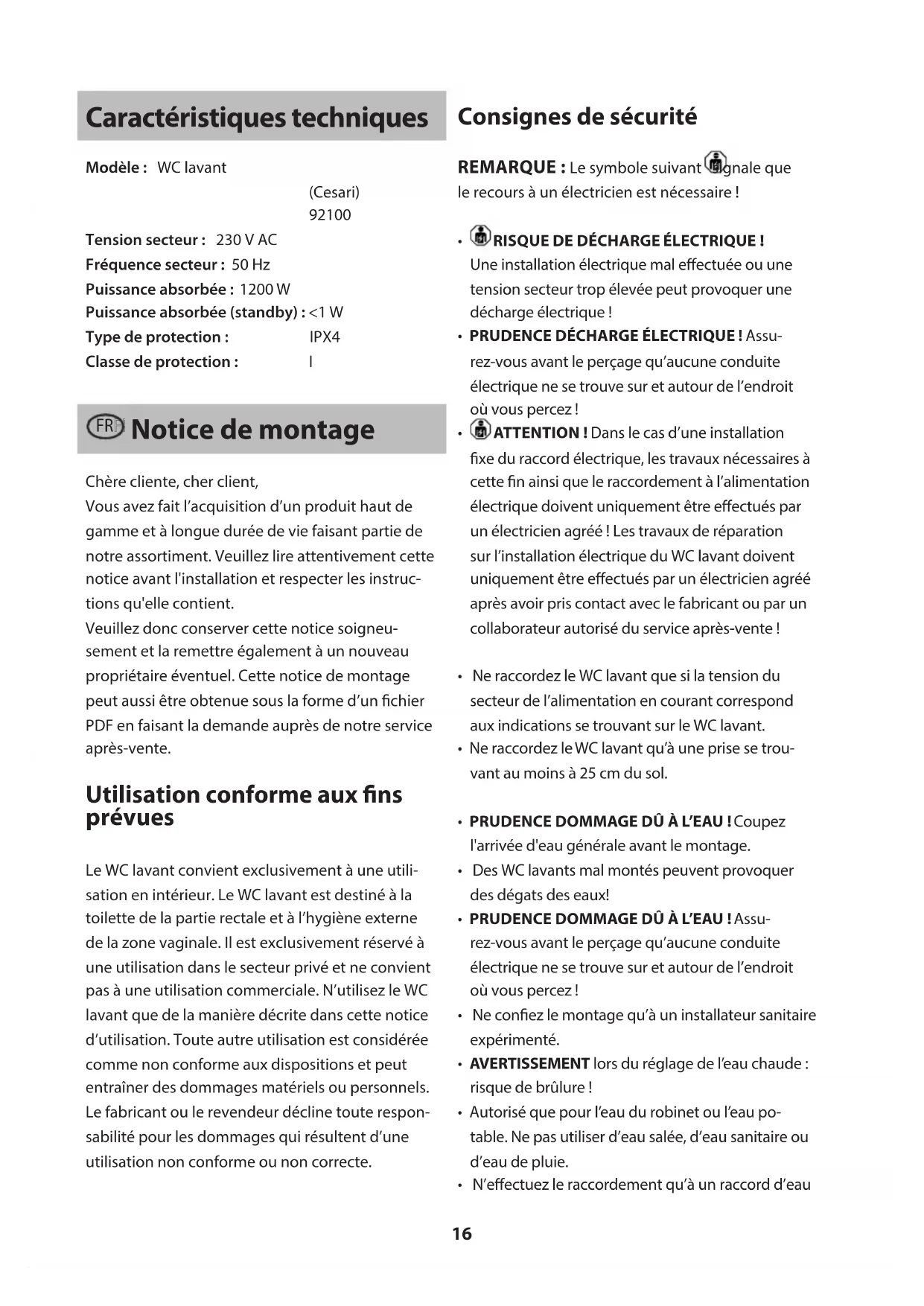 Tension secteur : 230 V AC Fréquence secteur : 50 Hz Puissance absorbée : 1200 W Puissance absorbée (standby) : <1 W Type de protection: IPX4 Classe de protection : I FRFR Notice de montage Chère cliente, cher client, Vous avez fait l’acquisition d’un produit haut de gamme et à longue durée de vie faisant partie de notre assortiment. Veuillez lire attentivement cette notice avant l'installation et respecter les instruc- tions qu'elle contient. Veuillez donc conserver cette notice soigneu- sement et la remettre également à un nouveau propriétaire éventuel. Cette notice de montage peut aussi être obtenue sous la forme d’un chier PDF en faisant la demande auprès de notre service après-vente. Utilisation conforme aux ns prévues Le WC lavant convient exclusivement à une utili- sation en intérieur. Le WC lavant est destiné à la toilette de la partie rectale et à l’hygiène externe de la zone vaginale. Il est exclusivement réservé à une utilisation dans le secteur privé et ne convient pas à une utilisation commerciale. N’utilisez le WC lavant que de la manière décrite dans cette notice d’utilisation. Toute autre utilisation est considérée comme non conforme aux dispositions et peut entraîner des dommages matériels ou personnels. Le fabricant ou le revendeur décline toute respon- sabilité pour les dommages qui résultent d’une utilisation non conforme ou non correcte. Consignes de sécurité REMARQUE: Le symbole suivant signale que le recours à un électricien est nécessaire!