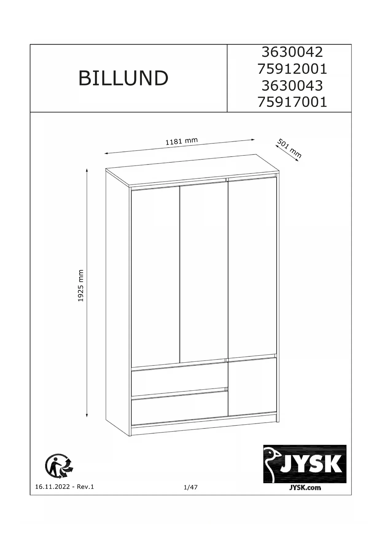 BILLUND 119x193 - Armoire JYSK - Notice d'utilisation et mode d'emploi gratuit