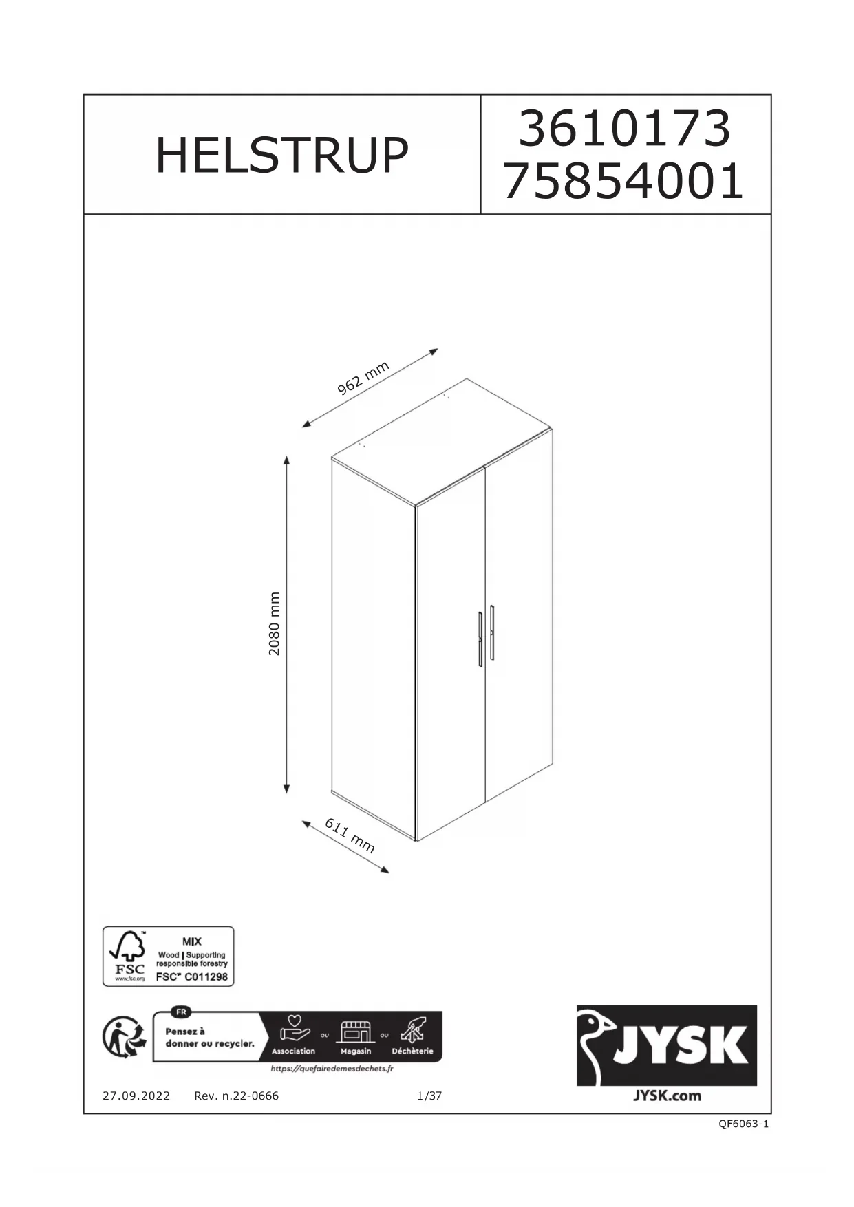 HELSTRUP 97x208 - Armoire JYSK - Notice d'utilisation et mode d'emploi gratuit