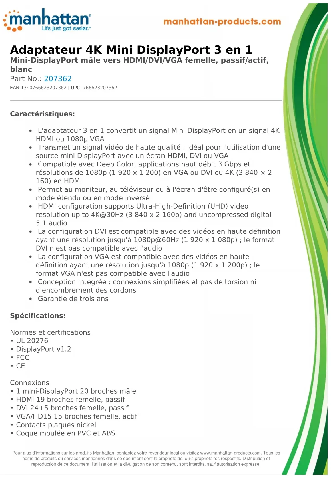 Adaptateur 4K Mini DisplayPort 3 en 1 Mini-DisplayPort mâle vers HDMI/DVI/VGA femelle, passif/actif, blanc Part No.: 207362 EAN-13: 0766623207362 | UPC: 766623207362 Caractéristiques: L'adaptateur 3 en 1 convertit un signal Mini DisplayPort en un signal 4K HDMI ou 1080p VGA Transmet un signal vidéo de haute qualité : idéal pour l'utilisation d'une source mini DisplayPort avec un écran HDMI, DVI ou VGA Compatible avec Deep Color, applications haut débit 3 Gbps et résolutions de 1080p (1 920 x 1 200) en VGA ou DVI ou 4K (3 840 × 2