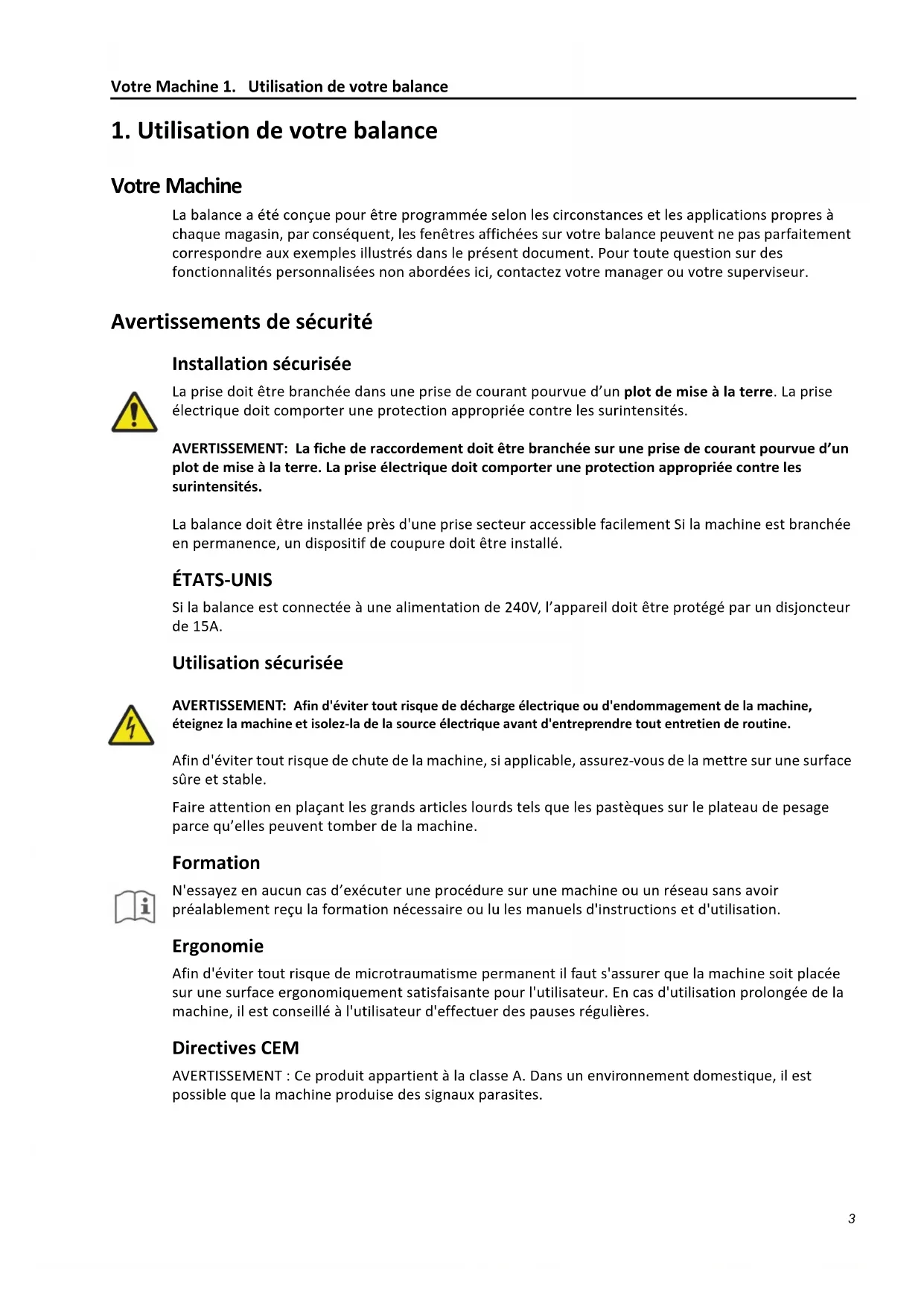 Votre Machine La balance a été conçue pour être programmée selon les circonstances et les applications propres à chaque magasin, par conséquent, les fenêtres affichées sur votre balance peuvent ne pas parfaitement correspondre aux exemples illustrés dans le présent document. Pour toute question sur des fonctionnalités personnalisées non abordées ici, contactez votre manager ou votre superviseur. Avertissements de sécurité Installation sécurisée La prise doit être branchée dans une prise de courant pourvue d’un plot de mise à la terre. La prise électrique doit comporter une protection appropriée contre les surintensités.