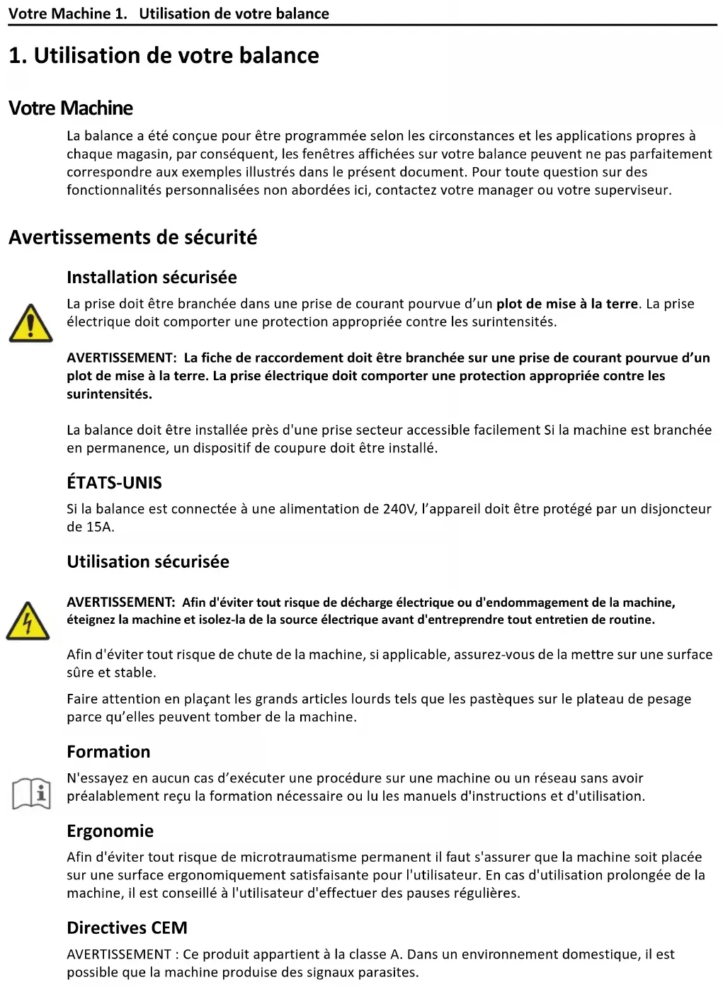 Votre Machine La balance a été conçue pour être programmée selon les circonstances et les applications propres à chaque magasin, par conséquent, les fenêtres affichées sur votre balance peuvent ne pas parfaitement correspondre aux exemples illustrés dans le présent document. Pour toute question sur des fonctionnalités personnalisées non abordées ici, contactez votre manager ou votre superviseur. Avertissements de sécurité Installation sécurisée La prise doit être branchée dans une prise de courant pourvue d’un plot de mise à la terre. La prise électrique doit comporter une protection appropriée contre les surintensités.