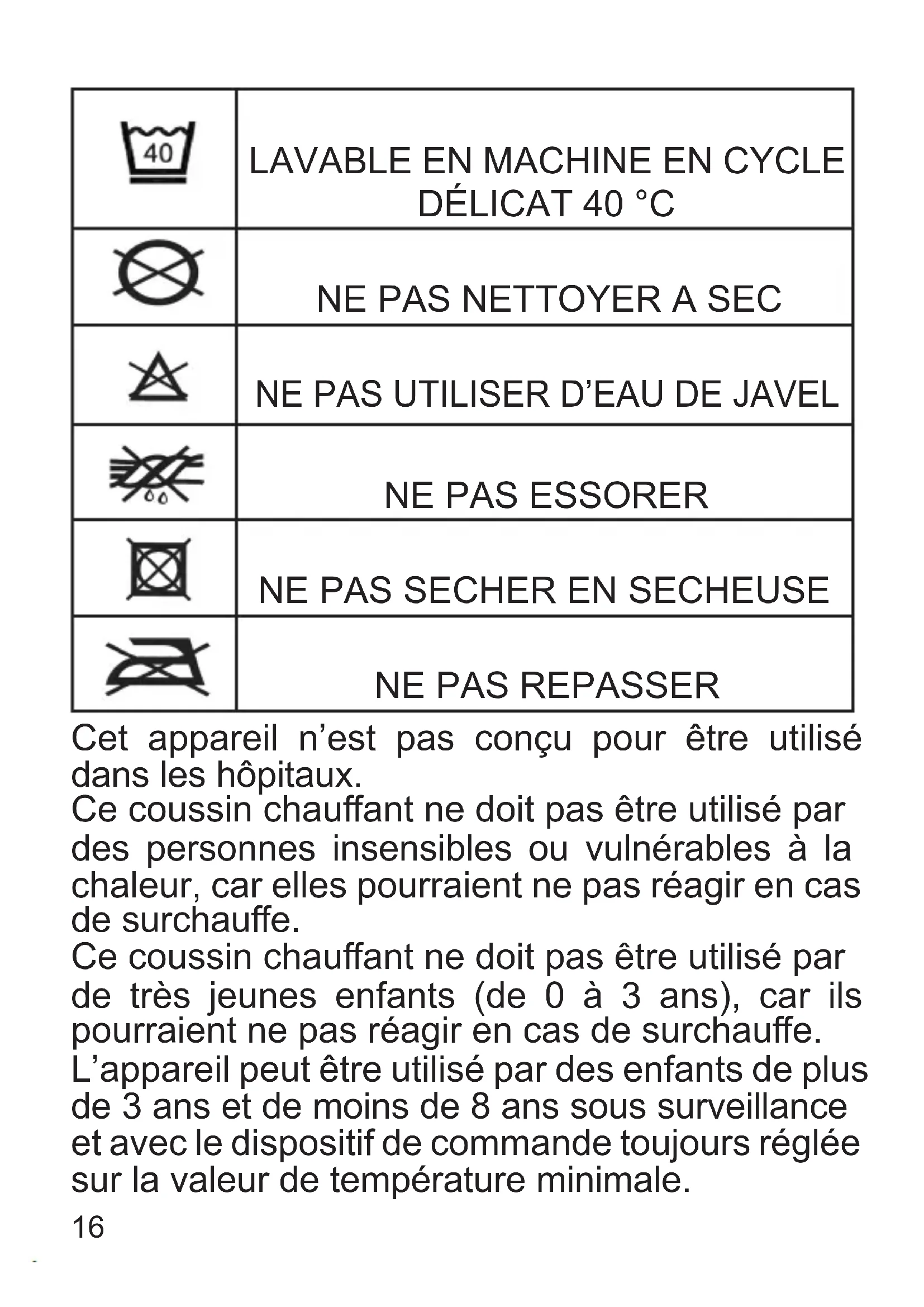Cet appareil n’est pas conçu pour être utilisé dans les hôpitaux. Ce coussin chauant ne doit pas être utilisé par des personnes insensibles ou vulnérables à la chaleur, car elles pourraient ne pas réagir en cas de surchaue. Ce coussin chauant ne doit pas être utilisé par de très jeunes enfants (de 0 à 3 ans), car ils pourraient ne pas réagir en cas de surchaue. L’appareil peut être utilisé par des enfants de plus de 3 ans et de moins de 8 ans sous surveillance et avec le dispositif de commande toujours réglée sur la valeur de température minimale.17 Cet appareil peut être utilisé par les enfants de plus de 8 ans et par les personnes aux capacités physiques, sensorielles ou mentales réduites, ou bien sans expérience ni connaissance à condition que ces derniers soient surveillés ou bien qu’ils aient reçus des instructions sur l’utilisation en toute sécurité de l’appareil et qu’ils aient compris les dangers liés à l’utilisation de ce dernier. Les enfants ne doivent pas jouer avec l’appareil. Les opérations de nettoyage et d’entretien ne doivent pas être eectuées par des enfants sans surveillance. Ne pas utiliser si humide ou mouille. N’utiliser l’appareil qu’avec le dispositif de commande indiqué sur l’appareil. Pour une utilisation continue ou prolongée de l’appareil, par exemple par un utilisateur qui pourrait s’endormir, régler le thermostat sur la position 1 an d’éviter toute brulure de la peau. Il est recommandé dans tous les cas d’éviter de s’endormir avec l’appareil en marche. Une application prolongée à une température élevée peut provoquer des brûlures de la peau. Laisser refroidir l’appareil avant de le plier et de le ranger. Ne pas plier ni déformer l’appareil en le rangeant en dessous d’autres objets. En cas de non-utilisation, ranger l’appareil dans son emballage d’origine dans un lieu sec et propre. Ne poser aucun objet lourd sur l’appareil.18 Cet appareil n’a pas besoin d’un entretien particulier, il sut d’examiner souvent tous les signes d’usure ou de détérioration de l’appareil, de son câble exible et de I’unité de contrôle. S’il y a tels signes ou si l’appareil a été mal utilisé, il faut le remettre à un centre d’assistance pour le contrôler avant de n’import quel autre usage. Si le câble d’alimentation est endommagé, adressez-vous aux Services Aprés-Vente autorisés par le constructeur. Le câble et le dispositif de commande de l’appareil peuvent entraîner des risques d’enchevêtrement, d’étranglement, de trébuchement ou de piétinement s’ils ne sont pas correctement disposés. L’utilisateur doit s’assurer que les attaches et câbles électriques excédentaires sont correctement acheminés. Pour le nettoyage de l’appareil, se référer au paragraphe ENTRETIEN. Les femmes enceintes, les diabétiques ou les porteurs de pacemaker doivent consulter un médecin avant d’utiliser cet appareil. Cet appareil a été conçu et produit pour fonctionner comme thermophore; tous les autres emplois seront considérés comme abusifs et donc dangereux.19 Après le déballage, vériez l’intégrité de l’appareil. En cas de dommage, n’utilisez pas l’appareil et appelez subitement le personnel qualié. Ne laissez jamais les parties de l’emballage auprès des enfants, ne les utilisez pas en tant que jouets: il s’agit d’un appareil électrique, il ne doit pas être utilisé autrement. Avant de brancher l’appareil, vériez si la tension de la prise de courant correspond à celle qui est indiquée sur la plaque. Si la che et la prise ne sont pas compatibles, faites remplacer la prise avec un type adéquat par un personnel qualié. N’utilisez pas adaptateurs ou rallonges non conformes aux normes de sécurité ou qui dépassent les limites des débits en valeur du courant. Débranchez toujours l’appareil du réseau de l’alimentation après son utilisation. Ne tirez pas le câble d’alimentation ou l’appareil pour extraire la che de la prise de courant. L’utilisation de tout appareil électrique demande le respect de quelques règles fondamentales, en particulier: - Ne pas toucher l’appareil avec les mains mouillées ou humides; - Ne pas soumettre l’appareil aux agents atmosphériques (pluie, soleil); - Éviter tout type de choc. Il est conseillé de dérouler complètement le câble d’alimentation dans toute sa longueur, en évitant ainsi des éventuelles surchaues. En cas de panne, d’intervention du fusible ou du thermofusible de protection, ou de dysfonctionnement de l´appareil, débrancher immédiatement la che, ne pas manipuler et s’adresser à un centre d’assistance agréé. Pour des raisons de sécurité, n’ouvrez pas l’appareil et l’unité de contrôle. Ne pas positionner l’unité de commande à proximité de sources de chaleur. Ne pas couvrir l’unité de commande et ne pas la positionner sur l’appareil durant le fonctionnement. L’appareil ne doit pas être soumis au poids du corps et il doit être toujours appliqué sur la partie endolorie. N’utilisez pas l’appareil en plein air.20 Branchez la prise du câble d’alimentation sur le panneau chauant et enlez ensuite la che dans la prise de courant. Allumez le coussin chauant en appuyant pendant quelques secondes sur la touche ON-OFF. L’appareil s’éclaire automatiquement dans la position 3. Pour changer la position de chauage appuyez plusieurs fois sur la touche TEMP jusqu’au niveau voulu, réglable de 1 à 6. Avant de l’utiliser, faire préchauer le coussin sur la position 6 pendant les 10 premières minutes, puis régler le thermostat sur la position désirée. En cas d’utilisation prolongée ou continue, régler le thermostat sur la position 1 de façon à éviter toute brulure de la peau. L’appareil s’éteint automatiquement au bout de 90 minutes de fonctionnement. Si le symbole P apparaît sur l’acheur contrôlez l