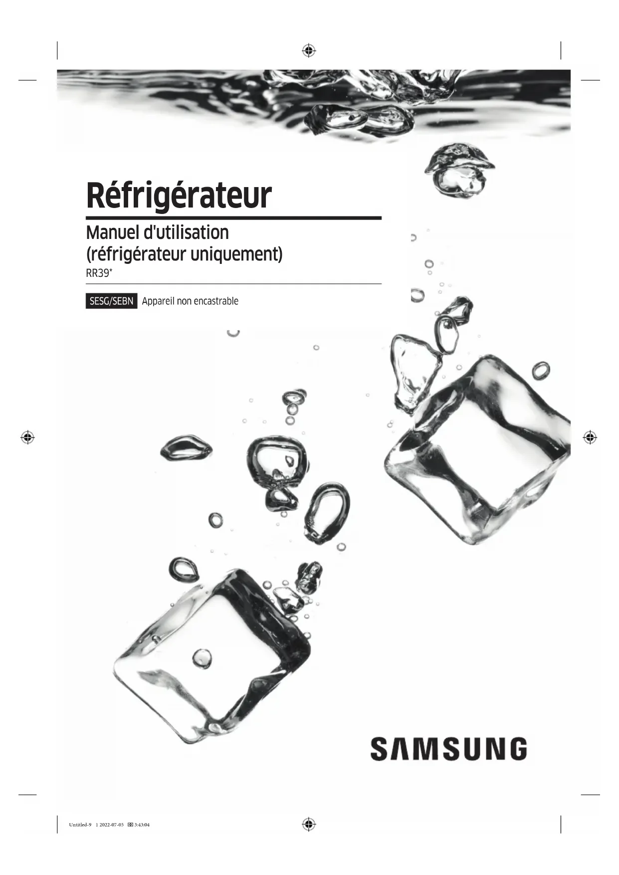 Réfrigérateur Manuel d'utilisation (réfrigérateur uniquement) RR39* SESG/SEBN Appareil non encastrable Untitled-9 1 2022-07-05 3:43:04Français2 Sommaire Sommaire Consignes de sécurité 4 Consignes de sécurité importantes et symboles : 7 Symboles d'avertissement importants concernant le transport et le lieu d'installation de l'appareil 8 Avertissements importants concernant l'installation 8 Installation en toute sécurité 13 Avertissements importants concernant l'utilisation 14 Avertissement relatif à l'utilisation 19 Utilisation en toute sécurité 20 Nettoyage en toute sécurité 22 Avertissements importants concernant la mise au rebut 23 Conseils complémentaires pour une utilisation appropriée 25 Conseils en matière d'économie d'énergie 26 Cet appareil est destiné à être utilisé dans les applications domestiques et similaires telles que : 27 Instructions concernant la règlementation DEEE 28 Installation 29 Présentation rapide du réfrigérateur 29 Installation étape par étape 30 Opérations 34 Panneau de commande 34 SmartThings (modèles applicables uniquement) 37 Entretien 39 Inversion des portes 39 Utilisation et entretien 48 Nettoyage 49 Remplacement 50 Installation en duo 51 Dépannage 58 Généralités 58 Entendez-vous des sons anormaux provenant du réfrigérateur ? 60 SmartThings (modèles applicables uniquement) 62