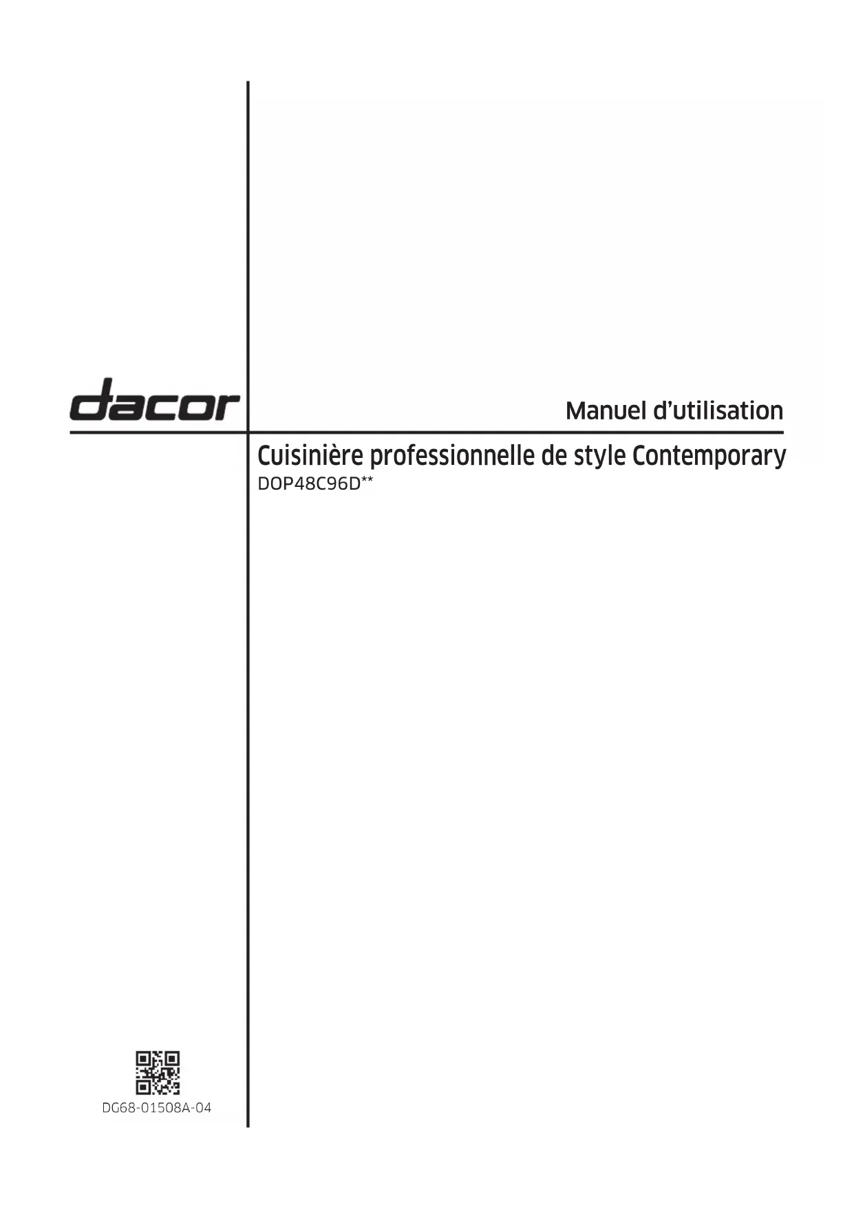- Bris, décoloration ou dommages au verre, aux surfaces métalliques, aux composants en plastique, aux garnitures, à la peinture ou à toute autre nition cosmétique causés par une utilisation, un entretien, un abus ou une négligence inappropriés. Hors garantie Si vous rencontrez un problème de service au-delà de la période de garantie standard, veuillez communiquer avec nous. Dacor examine chaque problème et préoccupation du client pour fournir la meilleure solution possible en fonction des circonstances. LES RECOURS PRÉVUS DANS LES GARANTIES EXPRESSES CI-DESSUS SONT LES SEULS ET UNIQUES RECOURS. PAR CONSÉQUENT, AUCUNE AUTRE GARANTIE EXPRESSE N’EST DONNÉE, ET EN DEHORS DES CINQUANTE ÉTATS DES ÉTATS-UNIS, DU DISTRICT DE COLUMBIA ET DU CANADA, TOUTES LES GARANTIES IMPLICITES, Y COMPRIS, MAIS SANS S’Y LIMITER, TOUTE GARANTIE IMPLICITE DE QUALITÉ MARCHANDE OU D’ADÉQUATION À UN USAGE OU UN BUT PARTICULIER, EST LIMITÉE À DEUX ANS À COMPTER DE LA DATE DE LIVRAISON À L’ACHETEUR CONSOMMATEUR INITIAL. EN AUCUN CAS DACOR NE SERA RESPONSABLE DES FRAIS ACCESSOIRES OU DES DOMMAGES INDIRECTS. EN CAS DE SUCCÈS DE DACOR DANS UN LITIGE, DACOR AURA DROIT AU REMBOURSEMENT DE TOUS LES FRAIS ET DÉPENSES, Y COMPRIS LES HONORAIRES D’AVOCAT, PAR LE CLIENT DE DACOR. AUCUNE GARANTIE, EXPRESSE OU IMPLICITE, N’EST FAITE À UN ACHETEUR POUR LA REVENTE. Certains États n’autorisent pas la limitation de la durée d’une garantie implicite, ou n’autorisent pas l’exclusion ou la limitation des dommages directs, ainsi les limitations ou exclusions ci- dessus peuvent ne pas s’appliquer dans votre situation. Cette garantie vous donne des droits légaux spéciques, et vous pouvez également avoir d’autres droits qui varient d’un état à l’autre.Français 103 Annexe Annexe Question Pour toute question concernant les caractéristiques, le fonctionnement ou les performances, les pièces, les accessoires ou le service. Veuillez composer le 833-353-5483(USA), 844-509-4659(CANADA) pour l’enregistrement de la garantie de votre produit Dacor. Nom du modèle et numéro de série Le nom du modèle et le numéro de série sont indiqués sur le côté gauche du produit. Pour une utilisation ultérieure, notez ces informations sur la page en cours. Nom du modèle Numéro de sérieFrançais104 Annonce du source ouverte Annonce du source ouverte Le logiciel inclus dans cette cuisinière contient un logiciel open-source. Vous pouvez obtenir le code source complet correspondant jusqu’à 3 ans après la dernière expédition de ce modèle en envoyant un courriel à : oss.request@samsung. com. Vous pouvez également obtenir le code source complet correspondant sur un support physique (par exemple, un CD-ROM) moyennant des frais minimes. Cet URL : http://opensource.samsung.com/opensource/OVEN_HKM_TZ/seq/0 mène à la page de téléchargement du code source et à des informations sur la licence open-source concernant ce modèle.NOTESNOTESNOTESDacor ∙ Téléphone : 833-353-5483 (États-Unis) , 844-509-4659 (CANADA). ∙ www.dacor.com