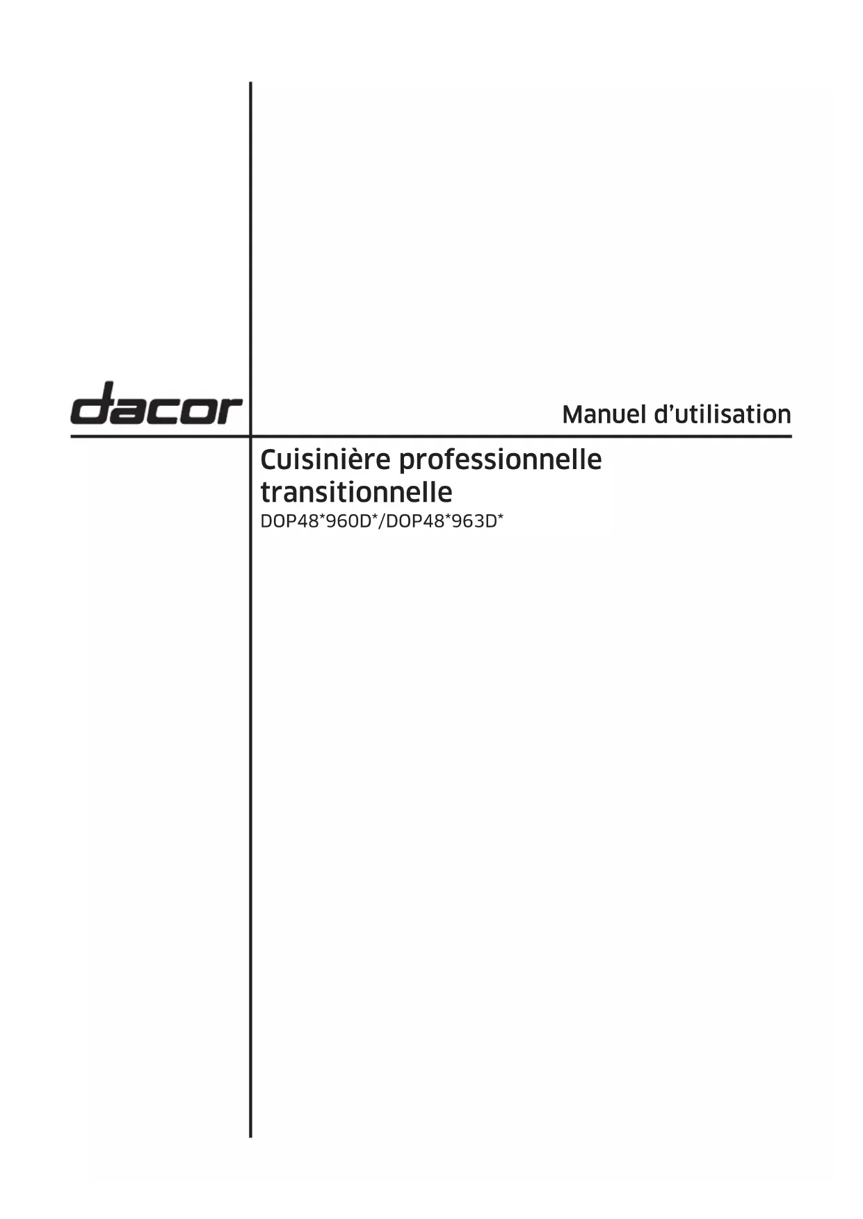 - Consulter le revendeur ou un technicien radio/TV expérimenté pour obtenir de l’aide. DÉCLARATION SUR L’EXPOSITION AU RAYONNEMENT : Ce dispositif est conforme aux limites d’exposition au rayonnement de la FCC et de l’IC RSS-102 établies pour un environnement non contrôlé. Ce dispositif doit être installé et utilisé de manière à ce qu’il y ait au moins 20 cm (8 po) entre le radiateur et votre corps. Cet appareil et son/ses antenne(s) ne doivent pas être placé(s) ensemble ni utilisé(s) conjointement avec une autre antenne ou un autre émetteur.À nos clients fidèles : Nous vous félicitons d’avoir acheté les tout derniers produits Dacor! La combinaison unique de nos caractéristiques, de notre style et de nos performances fait de nous un atout majeur pour votre maison. Pour vous familiariser avec les commandes, les fonctions et le plein potentiel de votre nouvel appareil Dacor, lisez attentivement ce manuel d’utilisation et d’entretien, en commençant par la section Avant de commencer. Nous concevons et fabriquons tous les appareils Dacor avec qualité et fierté, tout en travaillant dans le cadre des valeurs de notre entreprise. En cas de problème avec votre appareil, consultez d’abord la section Dépannage de ce manuel pour vous guider. Vous y trouverez des suggestions et des solutions utiles avant d’appeler le service après-vente. Les précieux commentaires de nos clients nous aident à améliorer continuellement nos produits et services. N’hésitez donc pas à communiquer avec notre équipe du service clientèle pour obtenir de l’aide sur n’importe quel produit. Assurance client de Dacor