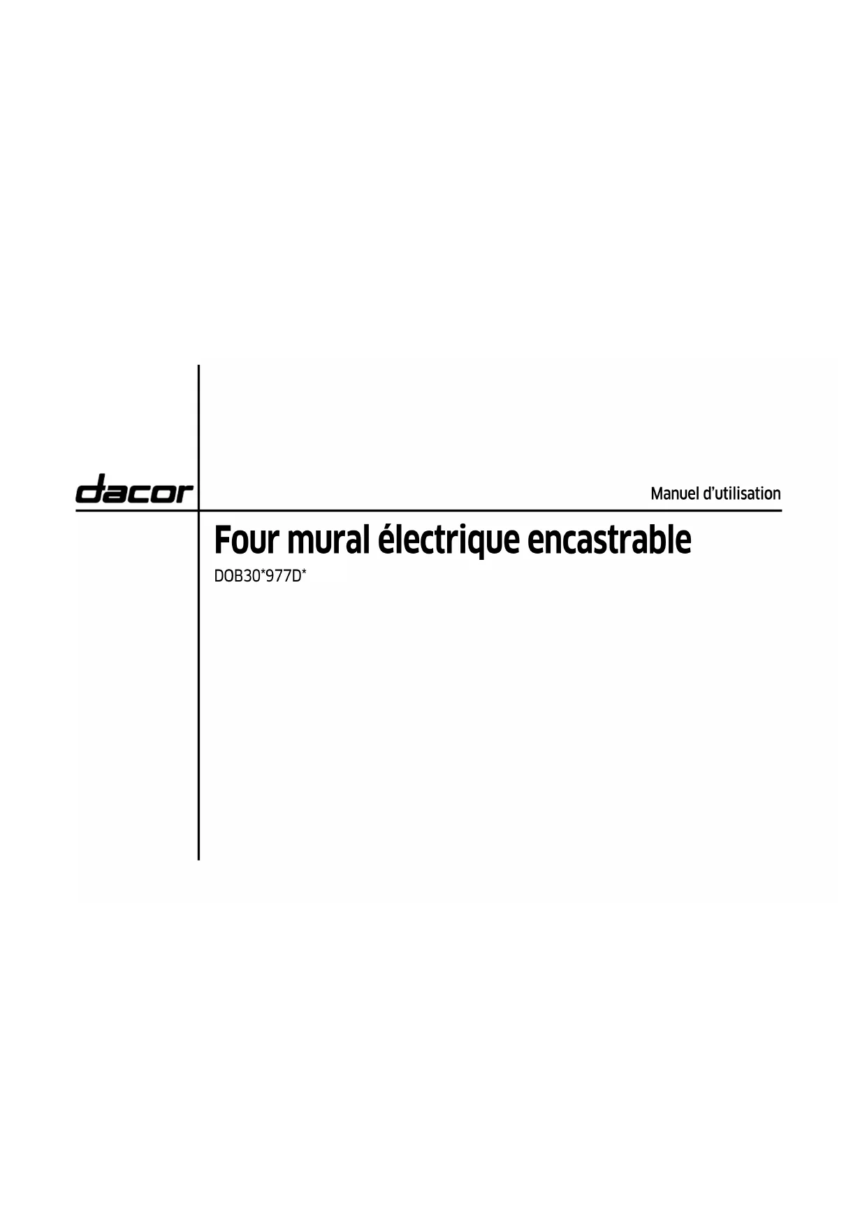 ATTENTION An de réduire les risques d'incendie, d'explosion, d'électrocution ou de blessures lors de l'utilisation du four, vous devez respecter ces règles de sécurité de base. NE PAS tenter. NE PAS démonter. NE PAS toucher. Suivez scrupuleusement les consignes. Débranchez la che d'alimentation de la prise murale. Assurez-vous que l'appareil est relié à la terre an d'éviter tout risque d'électrocution. Contactez un centre de maintenance Dacor. Remarque Les symboles d'avertissement sont là pour minimiser les risques de blessure ; veillez à bien les respecter. Après lecture de cette rubrique, conservez le manuel dans un endroit sûr an de pouvoir le consulter ultérieurement. Consignes de sécurité importantes Lisez et suivez toutes les consignes avant d'utiliser votre four an d'éviter tout risque d'incendie, d'électrocution, de blessure ou de dommage lors de l'utilisation du four. Le présent guide ne couvre pas toutes les situations susceptibles de se produire. Contactez toujours votre réparateur ou le fabricant en cas de fonctionnement anormal de l'appareil. CE QUE VOUS DEVEZ SAVOIR SUR LES CONSIGNES DE SÉCURITÉ Les avertissements et les consignes de sécurité importantes contenus dans ce manuel ne sont pas exhaustifs. Il est de votre responsabilité de faire appel à votre bon sens et de faire preuve de prudence et de minutie lors de l'installation, de l'entretien et de l'utilisation du four. Symboles de sécurité importants et précautions Signication des icônes et des symboles utilisés dans ce manuel : AVERTISSEMENT Risques ou manipulations dangereuses susceptibles d'entraîner des blessures graves, voire mortelles. ATTENTION Risques ou manipulations dangereuses susceptibles d'entraîner des blessures légères ou des dégâts matériels.6 Français Consignes de sécurité importantes Consignes de sécurité importantes