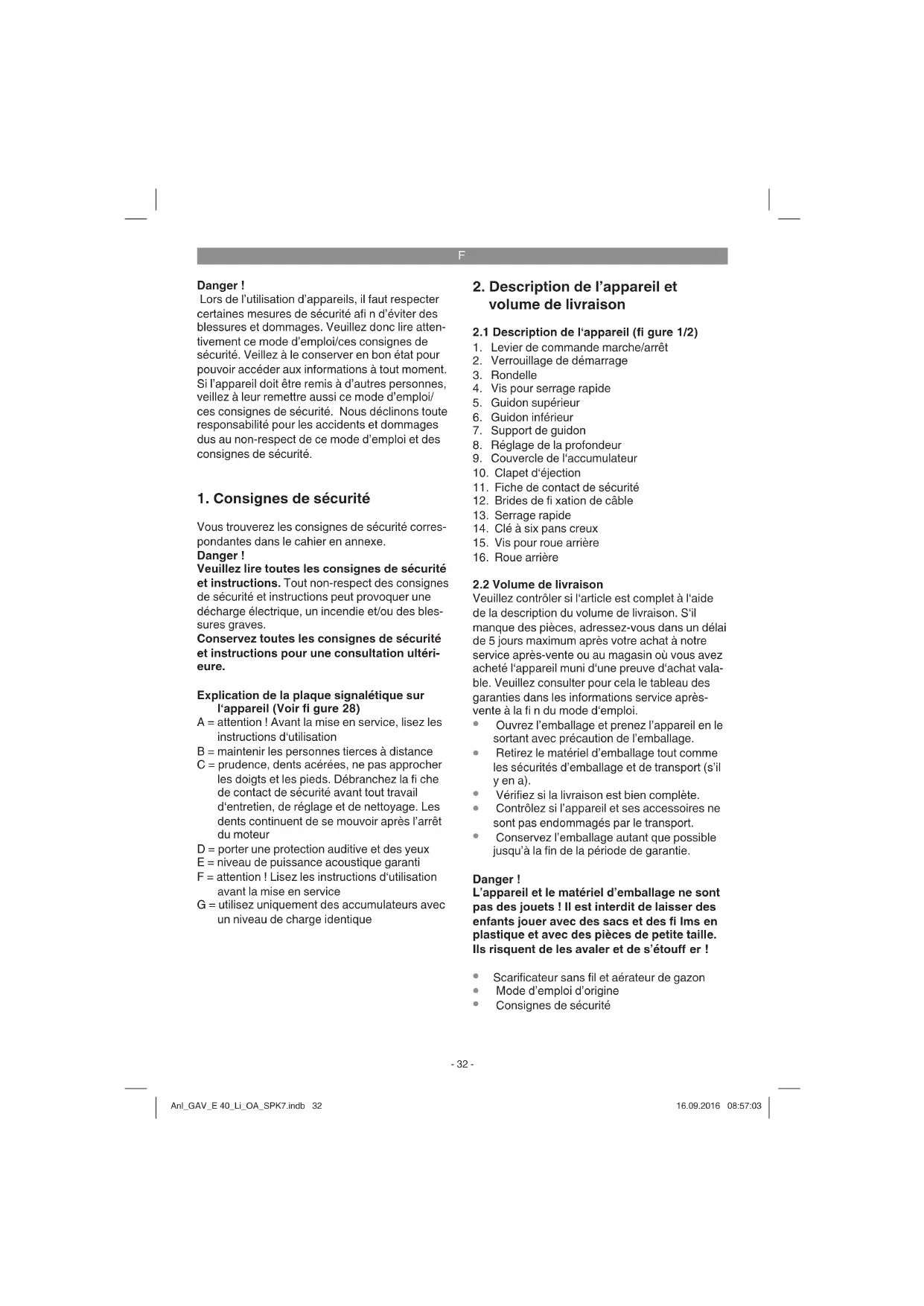 Vous trouverez les consignes de sécurité corres- pondantes dans le cahier en annexe. Danger ! Veuillez lire toutes les consignes de sécurité et instructions. Tout non-respect des consignes de sécurité et instructions peut provoquer une décharge électrique, un incendie et/ou des bles- sures graves. Conservez toutes les consignes de sécurité et instructions pour une consultation ultéri- eure. Explication de la plaque signalétique sur l‘appareil (Voir fi gure 28) A = attention ! Avant la mise en service, lisez les instructions d‘utilisation B = maintenir les personnes tierces à distance C = prudence, dents acérées, ne pas approcher les doigts et les pieds. Débranchez la fi che de contact de sécurité avant tout travail d‘entretien, de réglage et de nettoyage. Les dents continuent de se mouvoir après l’arrêt du moteur D = porter une protection auditive et des yeux E = niveau de puissance acoustique garanti F = attention ! Lisez les instructions d‘utilisation avant la mise en service G = utilisez uniquement des accumulateurs avec un niveau de charge identique