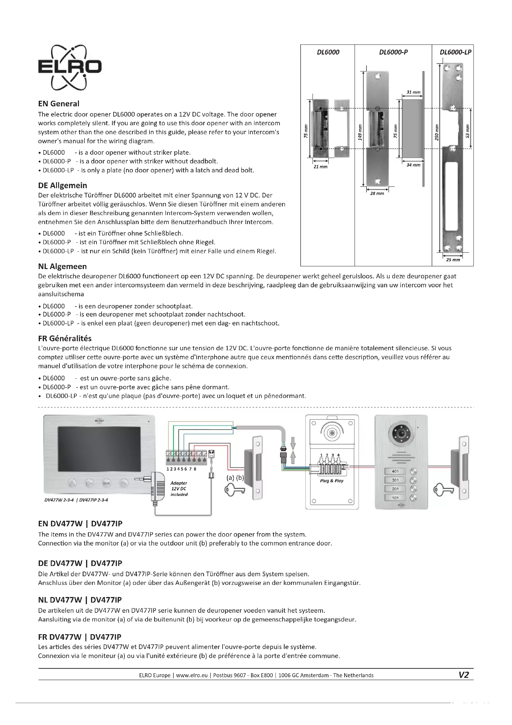 - DL6000-LP - n'est qu'une plaque (pas d'ouvre-porte) avec un loquet et un pênedormant. ELRO Europe | www.elro.eu | Postbus 9607 - Box E800 | 1006 GC Amsterdam - The Netherlands 1 2 3 4 5 6 7 8Adapter12V DC includedPlug & Play