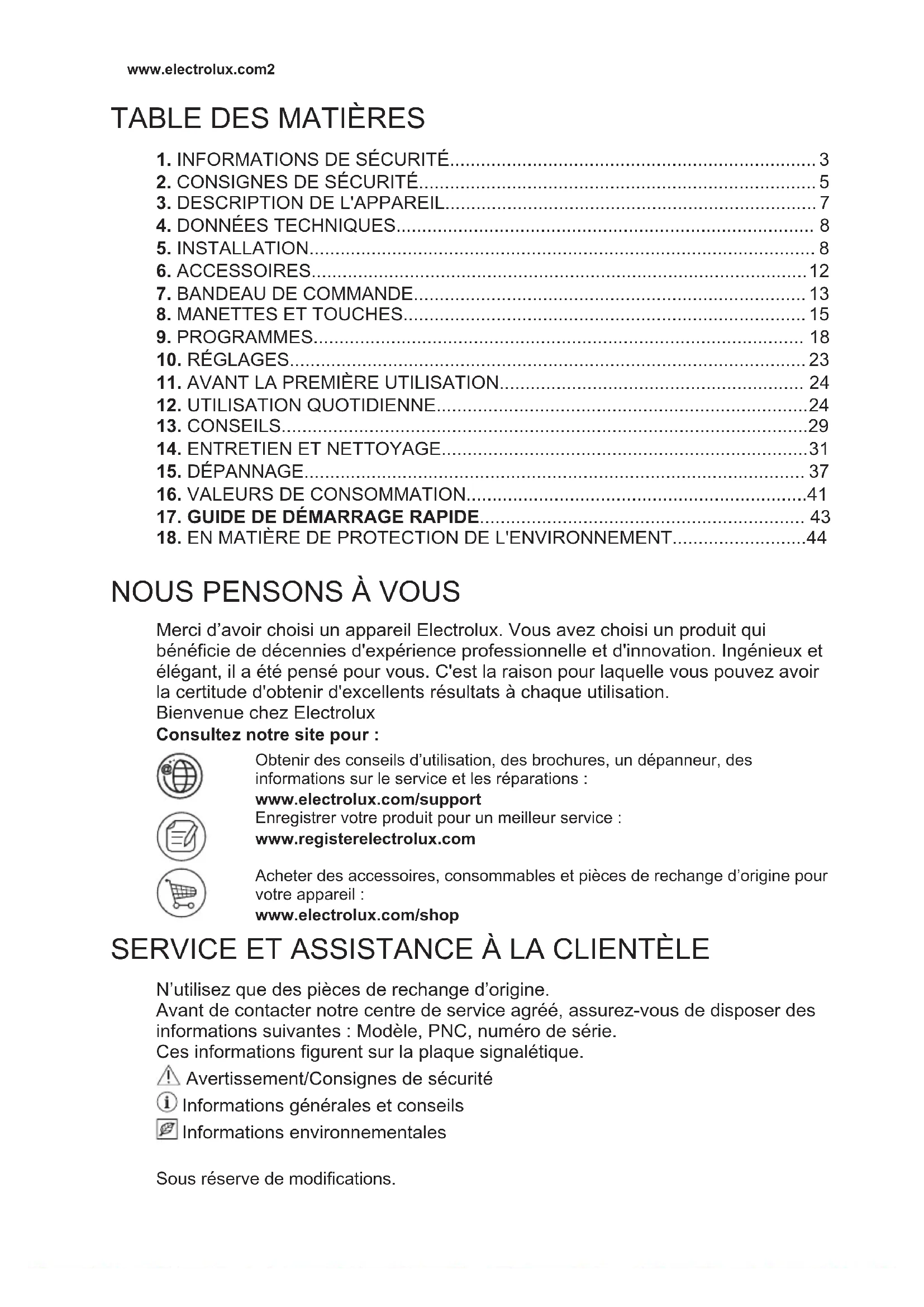 Merci d’avoir choisi un appareil Electrolux. Vous avez choisi un produit qui bénéficie de décennies d'expérience professionnelle et d'innovation. Ingénieux et élégant, il a été pensé pour vous. C'est la raison pour laquelle vous pouvez avoir la certitude d'obtenir d'excellents résultats à chaque utilisation. Bienvenue chez Electrolux Consultez notre site pour : Obtenir des conseils d’utilisation, des brochures, un dépanneur, des informations sur le service et les réparations : www.electrolux.com/support Enregistrer votre produit pour un meilleur service : www.registerelectrolux.com Acheter des accessoires, consommables et pièces de rechange d’origine pour votre appareil : www.electrolux.com/shop