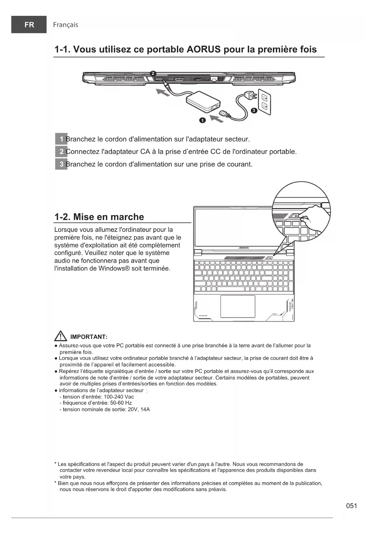 1 Branchez le cordon d'alimentation sur l'adaptateur secteur. 2 Connectez l'adaptateur CA à la prise d’entrée CC de l'ordinateur portable. 3 Branchez le cordon d'alimentation sur une prise de courant. 1-2. Mise en marche Lorsque vous allumez l'ordinateur pour la première fois, ne l'éteignez pas avant que le système d'exploitation ait été complètement conguré. Veuillez noter que le système audio ne fonctionnera pas avant que l'installation de Windows® soit terminée. IMPORTANT:● Assurez-vous que votre PC portable est connecté à une prise branchée à la terre avant de l’allumer pour la première fois.● Lorsque vous utilisez votre ordinateur portable branché à l’adaptateur secteur, la prise de courant doit être à proximité de l’appareil et facilement accessible.● Repérez l’étiquette signalétique d’entrée / sortie sur votre PC portable et assurez-vous qu’il corresponde aux informations de note d’entrée / sortie de votre adaptateur secteur. Certains modèles de portables, peuvent avoir de multiples prises d’entrées/sorties en fonction des modèles.● informations de l’adaptateur secteur