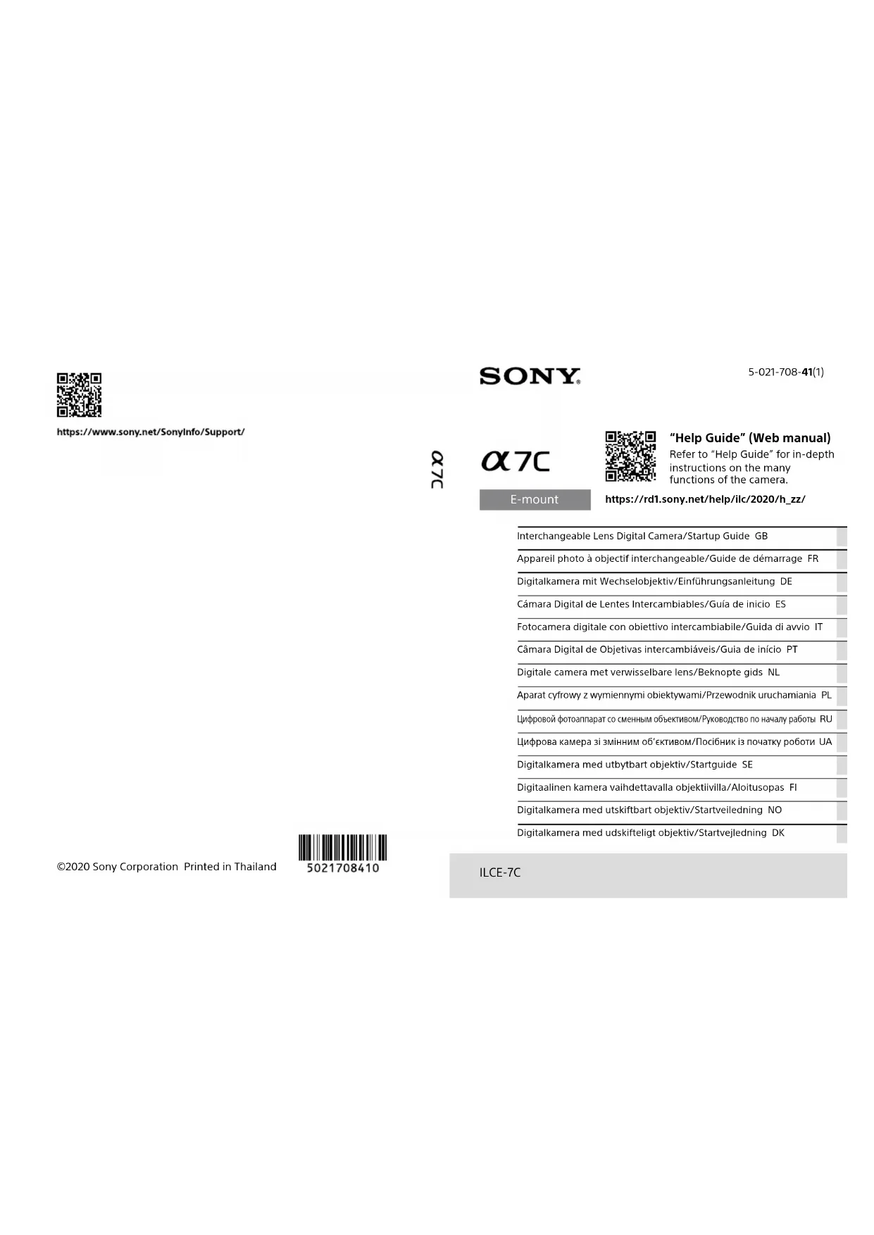 - XAVC S et sont des marques déposées de Sony Corporation.• USB Type-C® et USB-C® sont des marques déposées de USB Implementers Forum.• Android et Google Play sont des marques commerciales ou des marques déposées de Google LLC.• Wi-Fi, le logo Wi-Fi et Wi-Fi Protected Setup sont des marques commerciales ou des marques déposées de Wi-Fi Alliance. • QR Code est une marque commerciale de Denso Wave Inc. • En outre, les noms de système et de produit utilisés dans ce manuel sont généralement des marques commerciales ou des marques déposées de leurs créateurs ou fabricants respectifs. Cependant, les symboles ™ ou ne sont pas systématiquement utilisés dans ce manuel.Des informations complémentaires sur ce produit et des réponses à des questions fréquemment posées sont disponibles sur notre site Web d’assistance client.ILCE-7C5-021-708-41(1)