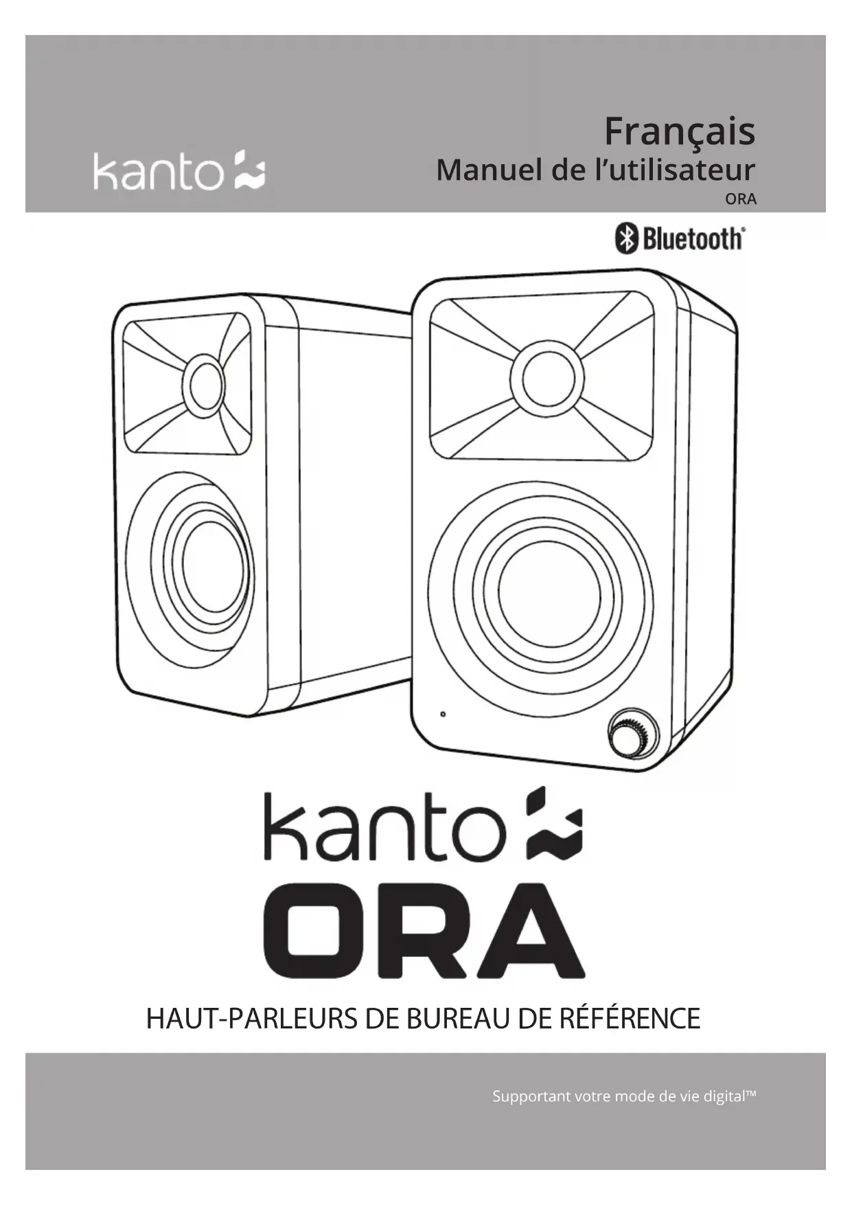 Supportant votre mode de vie digital™Introduction Merci d’avoir choisi ORA, conçu par Kanto au Canada. ORA comble le fossé entre les haut- parleurs d’ordinateur et les moniteurs de studio, vous orant un son de qualité audiophile sans dominer votre espace. ORA dispose d’entrées modernes telles que l’USB-C pour obtenir le meilleur son de votre PC ou Mac, le Bluetooth 5.0 pour le couplage à votre téléphone ou appareil domestique intelligent, et le RCA pour votre équipement analogique. Avec un ltre de croisement qui envoie automatiquement les basses à un subwoofer connecté, vous obtenez une intégration parfaite des basses fréquences, libérant les woofers de 3 po et les tweeters à dôme en soie de 3/4 po pour faire ce qu’ils font le mieux. ORA est le mélange parfait d’un son de qualité de référence et de fonctions modernes dans une taille susamment petite pour être installée sous votre écran. Nous vous recommandons de lire attentivement toutes les instructions avant d’utiliser le système, et de les conserver pour référence future. Kanto ne peut pas être tenu responsable pour des dommages causés par l’installation ou l’utilisation incorrecte de ce produit. Ce système d’enceintes ampliées a été soigneusement testé et inspecté en cours de production, et avant l’emballage et l’expédition. Après le déballage, s’il vous plaît vérier les dommages. Il est rare qu’un appareil est endommagé pendant le transport, mais si cela se produit, contactez votre revendeur immédiatement. Vous pouvez également appeler directement à Kanto 1-888-848-2643 ou par e-mail à support@kantoliving.com. Que contient la boîte? 3PANNEAUX AVANT 1 Tweeter à dôme en soie de 3/4” 2 Woofer à cône en papier (blindé magnétiquement) de 3/4” 3 LED Verte - RCA Jaune - USB Bleue - Pairage (clignotant) - Apparié (xe) 4 Volume / Sélection d’entrée / Marche / Arrêt