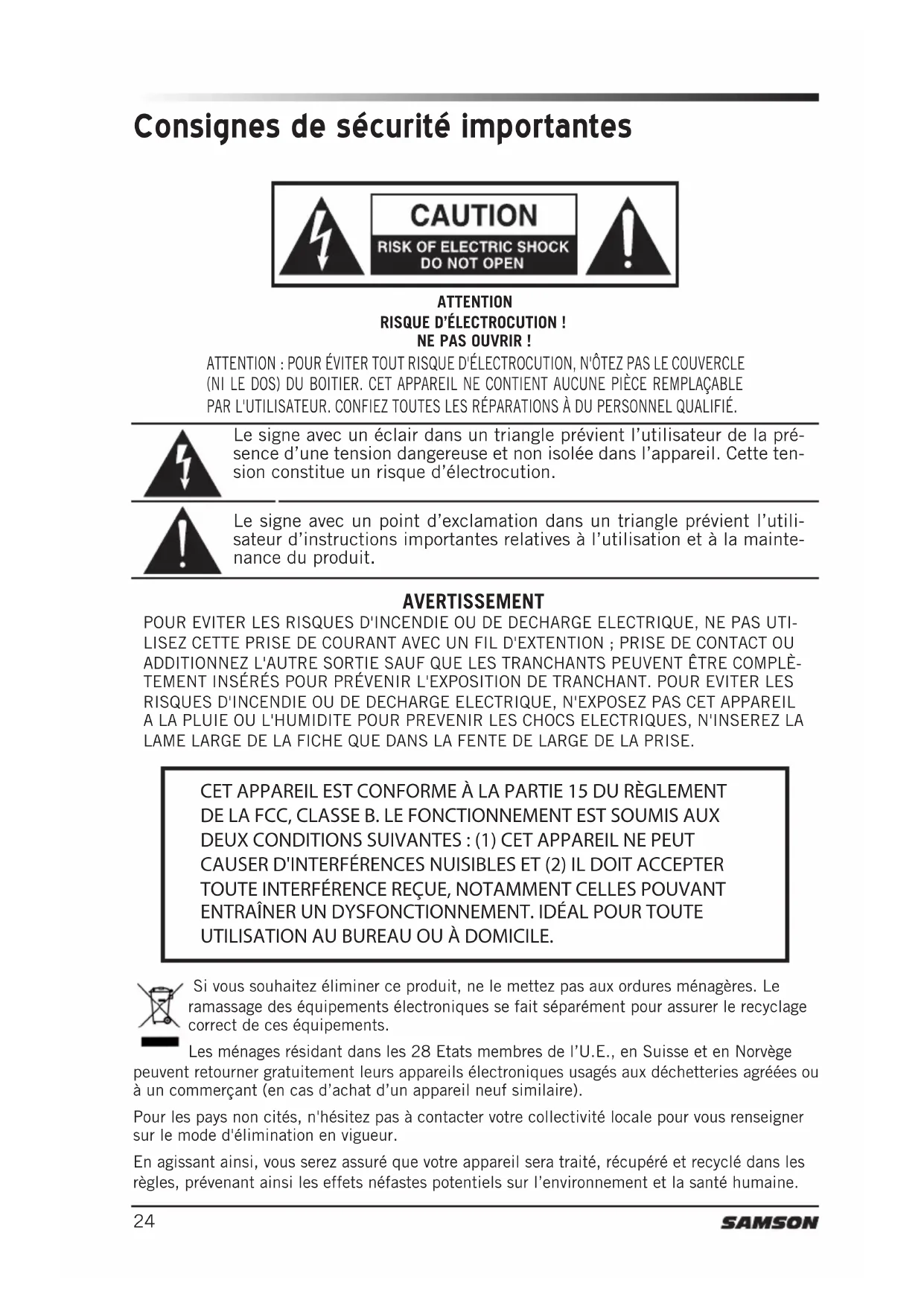compliance could void the user’s authority to operate the equipment. This equipment is intended for use in wireless microphone applications. Equipment is intended for sale in: AT, BE, CH, CY, CZ*, DK, EE, FI*, FR*, DE*, GR*, HU, IE, IS, IT, LV, LT*, LU, MT*, NL, NO*, PL* PT, RO, SK, SI, ES, SE, UK *Subject to license. Please contact your national frequency authority for information on available legal use in your area. Any changes or modifications not expressly approved by Samson Technologies Corp. could void your authority to operate the equipment.24 CET APPAREIL EST CONFORME À LA PARTIE 15 DU RÈGLEMENT DE LA FCC, CLASSE B. LE FONCTIONNEMENT EST SOUMIS AUX DEUX CONDITIONS SUIVANTES : (1) CET APPAREIL NE PEUT CAUSER D'INTERFÉRENCES NUISIBLES ET (2) IL DOIT ACCEPTER TOUTE INTERFÉRENCE REÇUE, NOTAMMENT CELLES POUVANT ENTRAÎNER UN DYSFONCTIONNEMENT. IDÉAL POUR TOUTE UTILISATION AU BUREAU OU À DOMICILE. Consignes de sécurité importantes ATTENTION: POUR ÉVITER TOUT RISQUE D'ÉLECTROCUTION, N'ÔTEZ PAS LE COUVERCLE (NI LE DOS) DU BOITIER. CET APPAREIL NE CONTIENT AUCUNE PIÈCE REMPLAÇABLE PAR L'UTILISATEUR. CONFIEZ TOUTES LES RÉPARATIONS À DU PERSONNEL QUALIFIÉ. Le signe avec un éclair dans un triangle prévient l’utilisateur de la pré- sence d’une tension dangereuse et non isolée dans l’appareil. Cette ten- sion constitue un risque d’électrocution. Le signe avec un point d’exclamation dans un triangle prévient l’utili- sateur d’instructions importantes relatives à l’utilisation et à la mainte- nance du produit. ATTENTION RISQUE D’ÉLECTROCUTION ! NE PAS OUVRIR ! AVERTISSEMENT POUR EVITER LES RISQUES D'INCENDIE OU DE DECHARGE ELECTRIQUE, NE PAS UTI- LISEZ CETTE PRISE DE COURANT AVEC UN FIL D'EXTENTION ; PRISE DE CONTACT OU ADDITIONNEZ L'AUTRE SORTIE SAUF QUE LES TRANCHANTS PEUVENT ÊTRE COMPLÈ- TEMENT INSÉRÉS POUR PRÉVENIR L'EXPOSITION DE TRANCHANT. POUR EVITER LES RISQUES D'INCENDIE OU DE DECHARGE ELECTRIQUE, N'EXPOSEZ PAS CET APPAREIL A LA PLUIE OU L'HUMIDITE POUR PREVENIR LES CHOCS ELECTRIQUES, N'INSEREZ LA LAME LARGE DE LA FICHE QUE DANS LA FENTE DE LARGE DE LA PRISE. Si vous souhaitez éliminer ce produit, ne le mettez pas aux ordures ménagères. Le ramassage des équipements électroniques se fait séparément pour assurer le recyclage correct de ces équipements. Les ménages résidant dans les 28 Etats membres de l’U.E., en Suisse et en Norvège peuvent retourner gratuitement leurs appareils électroniques usagés aux déchetteries agréées ou à un commerçant (en cas d’achat d’un appareil neuf similaire). Pour les pays non cités, n'hésitez pas à contacter votre collectivité locale pour vous renseigner sur le mode d'élimination en vigueur. En agissant ainsi, vous serez assuré que votre appareil sera traité, récupéré et recyclé dans les règles, prévenant ainsi les effets néfastes potentiels sur l’environnement et la santé humaine.25 Système sans fil Concert 88 ENGLISH