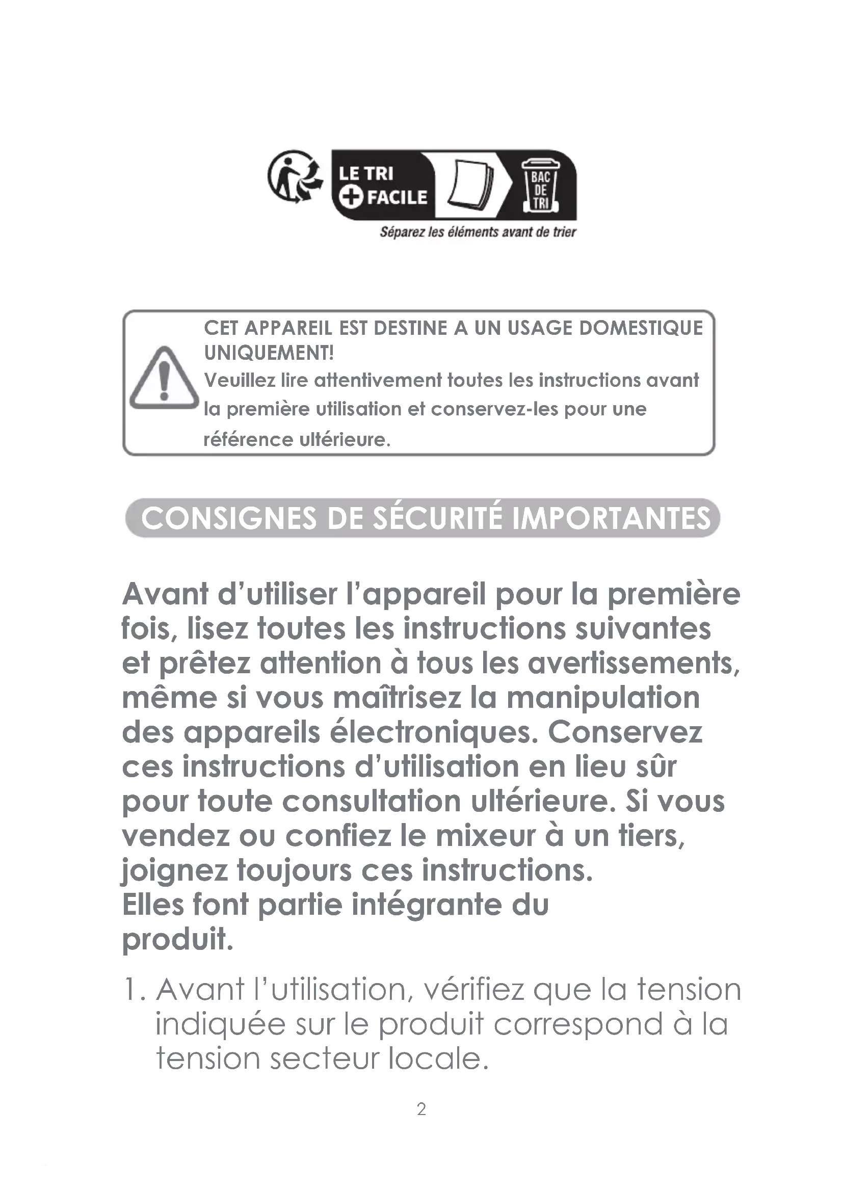 Avant d’utiliser l’appareil pour la première fois, lisez toutes les instructions suivantes et prêtez attention à tous les avertissements, même si vous maîtrisez la manipulation des appareils électroniques. Conservez ces instructions d’utilisation en lieu sûr pour toute consultation ultérieure. Si vous vendez ou confiez le mixeur à un tiers, joignez toujours ces instructions. Elles font partie intégrante du produit. CET APPAREIL EST DESTINE A UN USAGE DOMESTIQUE UNIQUEMENT! Veuillez lire attentivement toutes les instructions avant la première utilisation et conservez-les pour une référence ultérieure.