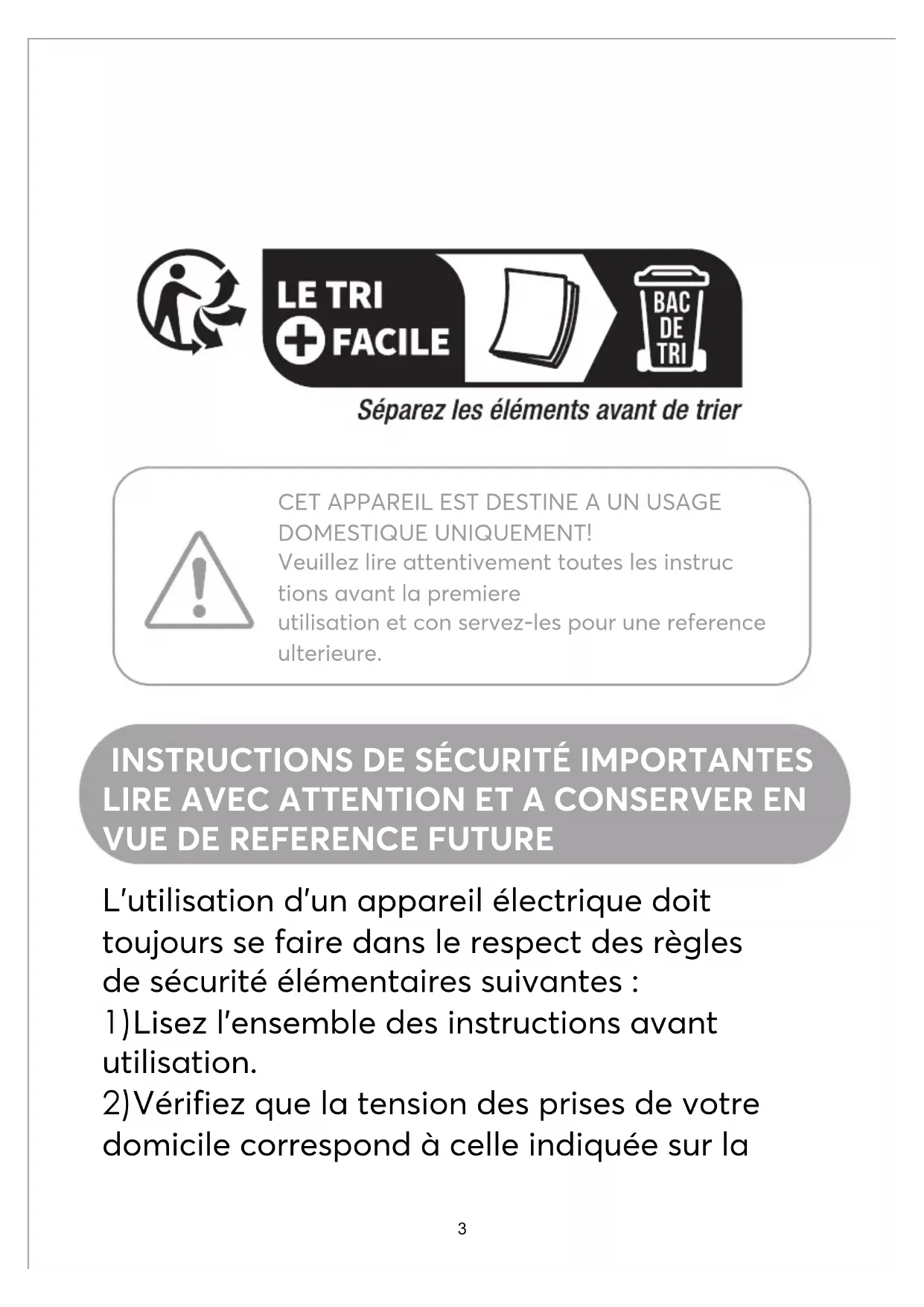 L'utilisation d'un appareil électrique doit toujours se faire dans le respect des règles de sécurité élémentaires suivantes : 1)Lisez l’ensemble des instructions avant utilisation. 2)Vérifiez que la tension des prises de votre domicile correspond à celle indiquée sur laplaque signalétique de l'appareil, et que la prise est bien reliée à la terre.