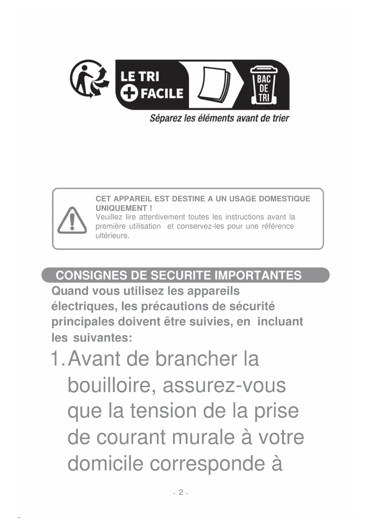 Avant de brancher la bouilloire, assurez-vous que la tension de la prise de courant murale à votre domicile corresponde à CET APPAREIL EST DESTINE A UN USAGE DOMESTIQUE UNIQUEMENT ! Veuillez lire attentivement toutes les instructions avant la première utilisation et conservez-les pour une référence ultérieure.