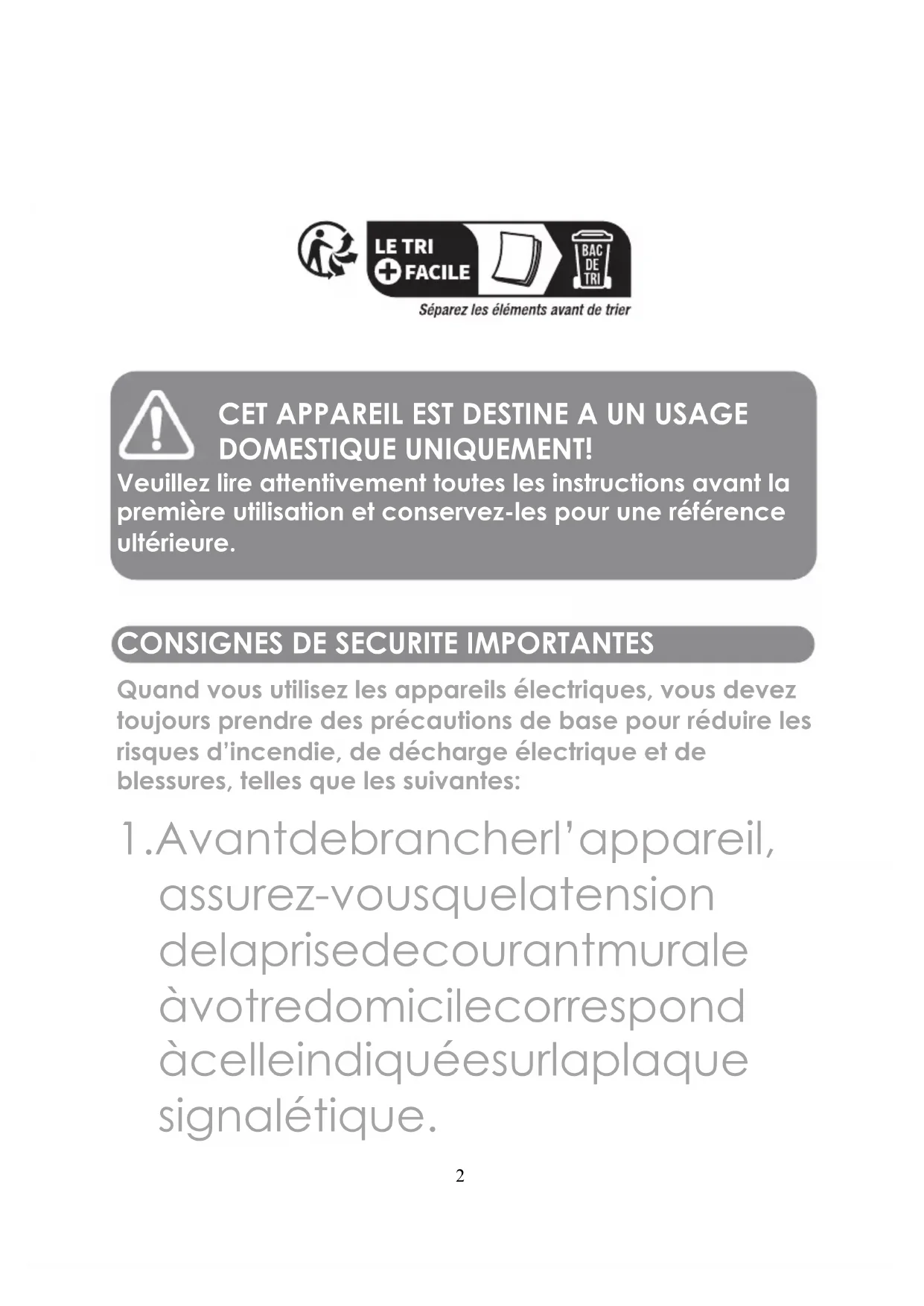 assurez-vous que la tension de la prise de courant murale à votre domicile correspond à celle indiquée sur la plaque signalétique. Veuillez lire attentivement toutes les instructions avant la première utilisation et conservez-les pour une référence ultérieure.3