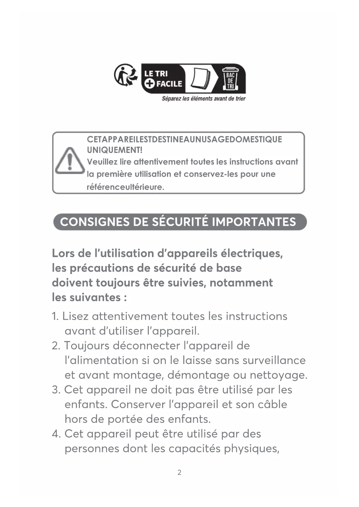 Lors de l’utilisation d’appareils électriques, les précautions de sécurité de base doivent toujours être suivies, notamment les suivantes : CET APPAREIL EST DESTINE A UN USAGE DOMESTIQUE UNIQUEME NT! Veuillez lire attentivement toutes les instructions avant la première utilisation et conservez-les pour une référence ultérieure.