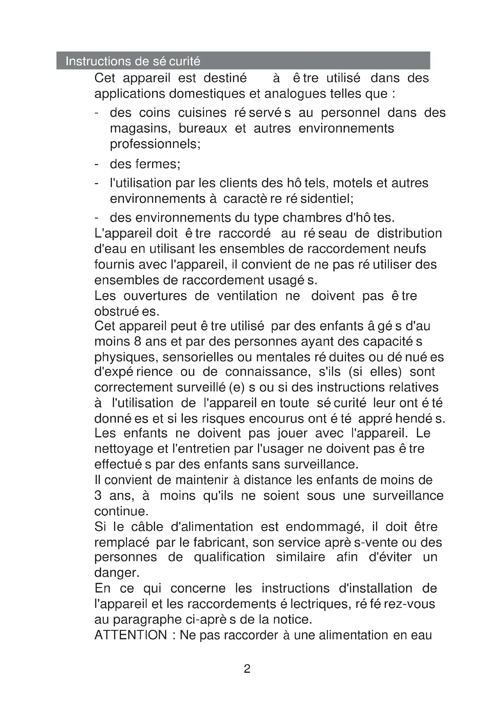 des environnements du type chambres d'hôtes. L'appareil doit être raccordé au réseau de distribution d'eau en utilisant les ensembles de raccordement neufs fournis avec l'appareil, il convient de ne pas réutiliser des ensembles de raccordement usagés. Les ouvertures de ventilation ne doivent pas être obstruées. Cet appareil peut être utilisé par des enfants âgés d'au moins 8 ans et par des personnes ayant des capacités physiques, sensorielles ou mentales réduites ou dénuées d'expérience ou de connaissance, s'ils (si elles) sont correctement surveillé(e) s ou si des instructions relatives à l'utilisation de l'appareil en toute sécurité leur ont été données et si les risques encourus ont été appréhendés. Les enfants ne doivent pas jouer avec l'appareil. Le nettoyage et l'entretien par l'usager ne doivent pas être effectués par des enfants sans surveillance. Il convient de maintenir à distance les enfants de moins de 3 ans, à moins qu'ils ne soient sous une surveillance continue. Si le câble d'alimentation est endommagé, il doit être remplacé par le fabricant, son service après-vente ou des personnes de qualification similaire afin d'éviter un danger. En ce qui concerne les instructions d'installation de l'appareil et les raccordements électriques, référez-vous au paragraphe ci-après de la notice. ATTENTION : Ne pas raccorder à une alimentation en eau Instructions de sécurité3