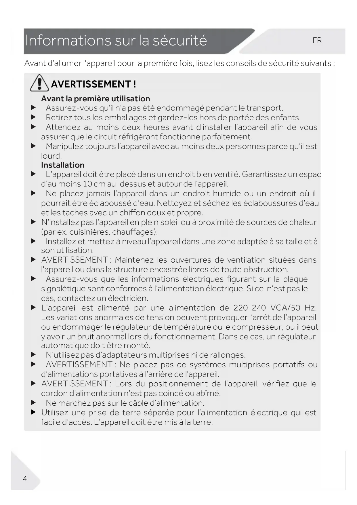 Informati ons sur la sécurité Avant d’allumer l’appareil pour la première fois, lisez les conseils de sécurité suivants : AVERTISSEMENT ! Avant la première utilisation Assurez-vous qu’il n’a pas été endommagé pendant le transport. Retirez tous les emballages et gardez-les hors de portée des enfants. Attendez au moins deux heures avant d’installer l’appareil afin de vous assurer que le circuit réfrigérant fonctionne parfaitement. Manipulez toujours l’appareil avec au moins deux personnes parce qu’il est lourd. Installation L’appareil doit être placé dans un endroit bien ventilé. Garantissez un espace d’au moins 10 cm au-dessus et autour de l’appareil. Ne placez jamais l’appareil dans un endroit humide ou un endroit où il pourrait être éclaboussé d’eau. Nettoyez et séchez les éclaboussures d’eau et les taches avec un chiffon doux et propre. N’installez pas l’appareil en plein soleil ou à proximité de sources de chaleur (par ex. cuisinières, chauffages). Installez et mettez à niveau l’appareil dans une zone adaptée à sa taille et à son utilisation.