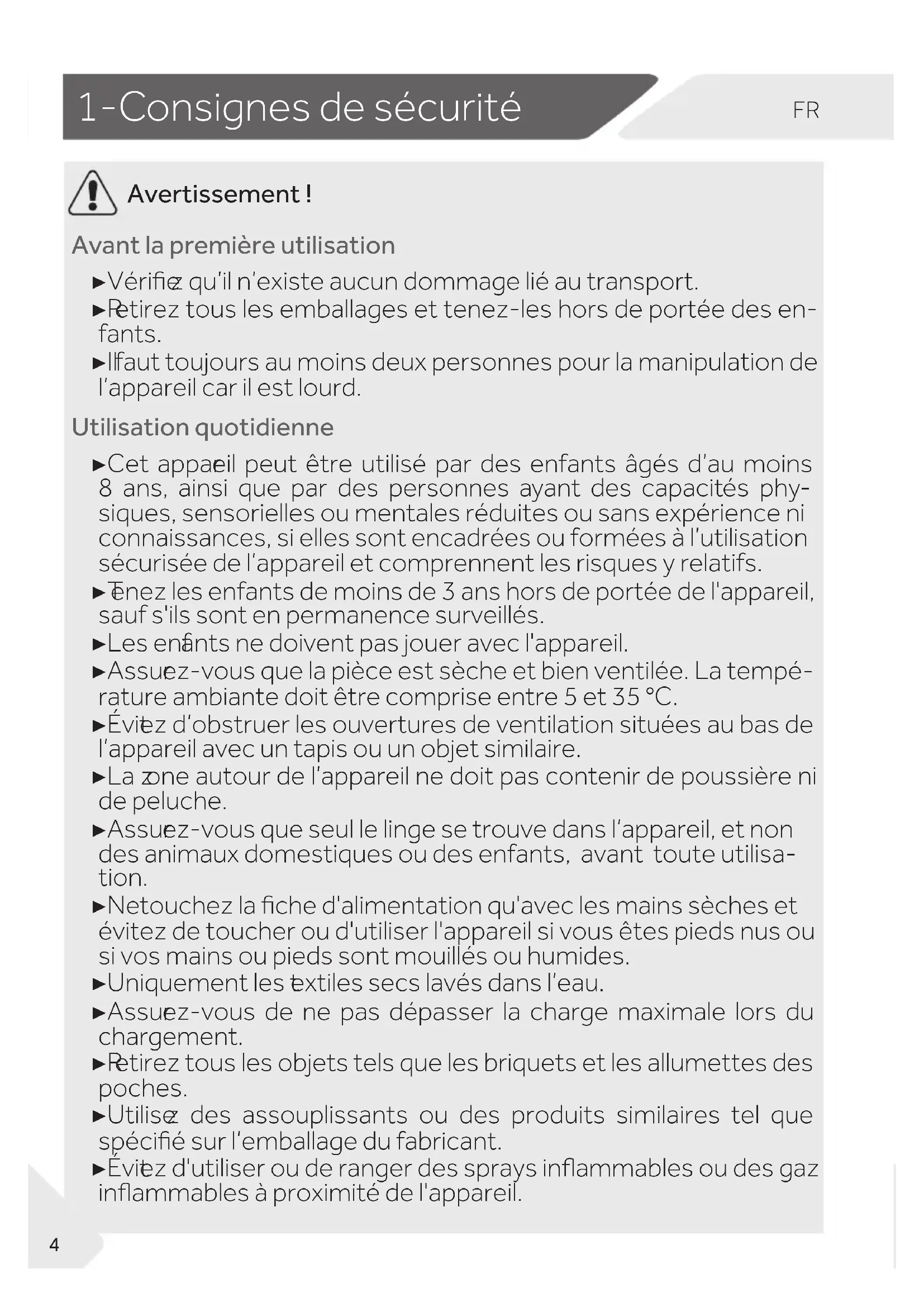Avertissement! Avant la première utilisation ▶ Vérie z qu’il n’existe aucun dommage lié au transport. ▶ R etirez tous les emballages et tenez-les hors de portée des en- fants. ▶ Il faut toujours au moins deux personnes pour la manipulation de l’appareil car il est lourd. Utilisation quotidienne ▶ Cet appar eil peut être utilisé par des enfants âgés d’au moins 8 ans, ainsi que par des personnes ayant des capacités phy- siques, sensorielles ou mentales réduites ou sans expérience ni connaissances, si elles sont encadrées ou formées à l’utilisation sécurisée de l’appareil et comprennent les risques y relatifs. ▶ T enez les enfants de moins de 3ans hors de portée de l'appareil, sauf s'ils sont en permanence surveillés. ▶ Les enf ants ne doivent pas jouer avec l'appareil. ▶ Assur ez-vous que la pièce est sèche et bien ventilée. La tempé- rature ambiante doit être comprise entre 5 et 35°C. ▶ Évit ez d’obstruer les ouvertures de ventilation situées au bas de l’appareil avec un tapis ou un objet similaire. ▶ La z one autour de l’appareil ne doit pas contenir de poussière ni de peluche. ▶ Assur ez-vous que seul le linge se trouve dans l’appareil, et non des animaux domestiques ou des enfants, avant toute utilisa- tion. ▶ Ne touchez la che d'alimentation qu'avec les mains sèches et évitez de toucher ou d'utiliser l'appareil si vous êtes pieds nus ou si vos mains ou pieds sont mouillés ou humides. ▶ Uniquement les t extiles secs lavés dans l’eau. ▶ Assur ez-vous de ne pas dépasser la charge maximale lors du chargement. ▶ R etirez tous les objets tels que les briquets et les allumettes des poches. ▶ Utilise z des assouplissants ou des produits similaires tel que spécié sur l’emballage du fabricant. ▶ Évit ez d'utiliser ou de ranger des sprays inammables ou des gaz inammables à proximité de l'appareil.FR 1-C onsignes de sécurité