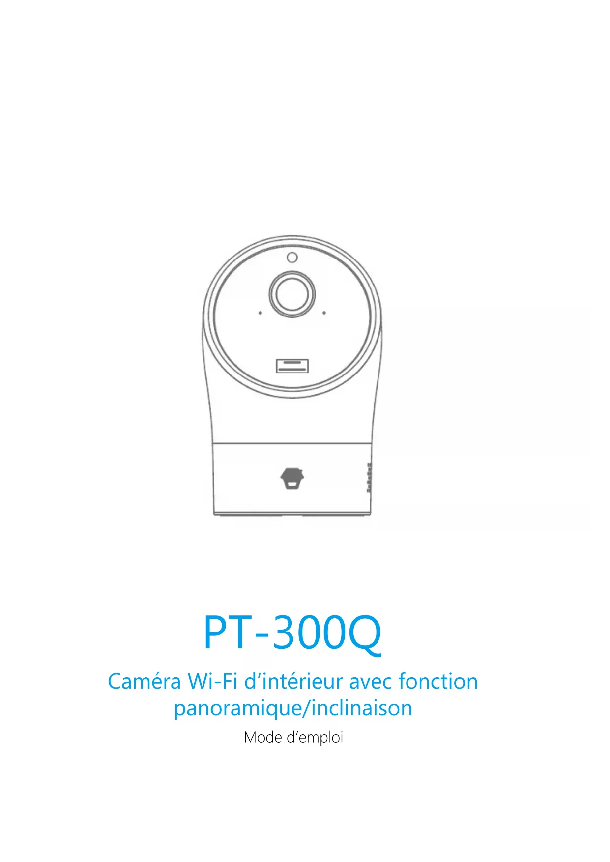 - PT-300Q Caméra Wi-Fi d’intérieur avec fonction panoramique/inclinaison Mode d’emploiRemarques importantes avant de commencer Connexion Internet Wi-Fi à haut débit L’un des facteurs essentiels réduisant les performances de votre caméra PT-300Q est la position relative de votre routeur familial Wi-Fi et du PT-300Q. Installez votre PT-300Q dans un espace dégagé (ne l’installez PAS directement sur le sol) ; plus la caméra est proche du routeur, plus le signal Wi-Fi sera fort et meilleures seront les images sur votre smartphone. Un faible débit de réseau réduira également les performances de votre caméra PT- 300Q. Il est recommandé d’utiliser une vitesse de téléchargement montant d’au moins 2 Mbit/s ou plus pour la caméra. Vous pouvez facilement tester les vitesses de transfert et de téléchargement de votre réseau en obtenant l’application Spee- dtest. La caméra PT-300Q prend en charge uniquement la bande Wi-Fi 2,4 GHz. SSID et mot de passe Tenez à portée de main le nom de votre réseau Wi-Fi et votre mot de passe. Le nom de réseau Wi-Fi est appelé normalement SSID. Le mot de passe ou l’identiant réseau gure normalement à la ligne suivant ou deux lignes en-dessous du nom de réseau Wi-Fi/SSID. Vous trouverez facilement ces informations sur votre routeur Wi-Fi si elles ont été laissées par défaut pendant la conguration du routeur, par exemple : Nom réseau Wi-Fi/SSID : XXXX Clé de sécurité/mot de passe du réseau Wi-Fi/SSID : XXXXX Conguration système minimale - iOS 9.0 ou version ultérieure avec iPhone 6 ou un modèle plus récent - Android 6.0 ou version supérieure Contents Get to Know Your PT-300Q Camera p. 1