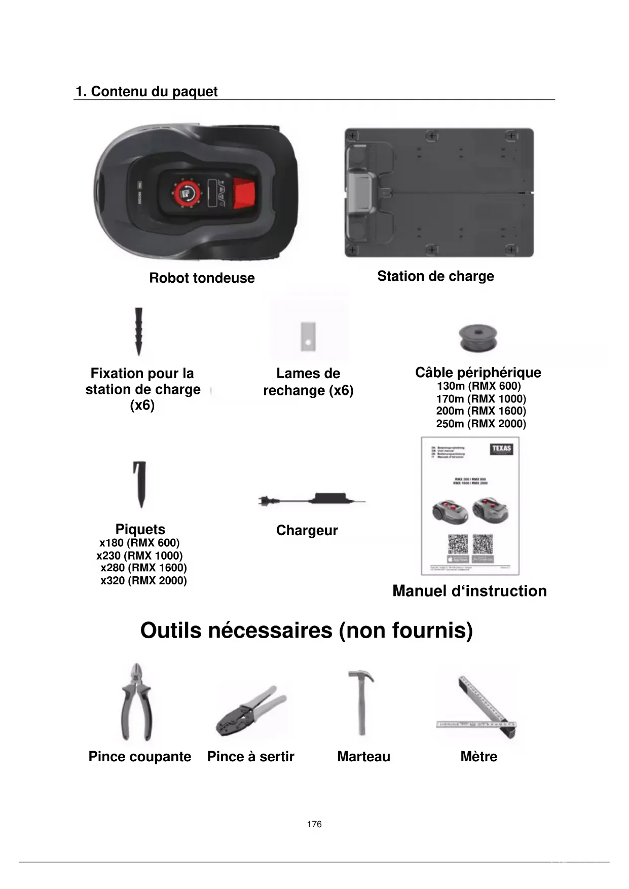 Robot tondeuse Station de charge Fixation pour la station de charge (x6) Lames de rechange (x6) Câble périphérique 130m (RMX 600) 170m (RMX 1000) 200m (RMX 1600) 250m (RMX 2000) Piquets x180 (RMX 600) x230 (RMX 1000) x280 (RMX 1600) x320 (RMX 2000) Chargeur Manuel d‘instruction Pince coupante Pince à sertir Marteau Mètre Outils nécessaires (non fournis)177