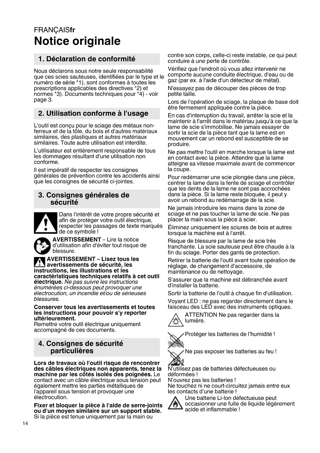 Notice originale Nous déclarons sous notre seule responsabilité que ces scies sauteuses, identifiées par le type et le numéro de série *1), sont conformes à toutes les prescriptions applicables des directives *2) et normes *3). Documents techniques pour *4) - voir page 3. L'outil est conçu pour le sciage des métaux non- ferreux et de la tôle, du bois et d'autres matériaux similaires, des plastiques et autres matériaux similaires. Toute autre utilisation est interdite. L'utilisateur est entièrement responsable de tous les dommages résultant d'une utilisation non conforme. Il est impératif de respecter les consignes générales de prévention contre les accidents ainsi que les consignes de sécurité ci-jointes. Dans l'intérêt de votre propre sécurité et afin de protéger votre outil électrique, respecter les passages de texte marqués de ce symbole ! AVERTISSEMENT – Lire la notice d'utilisation afin d'éviter tout risque de blessure. AVERTISSEMENT – Lisez tous les avertissements de sécurité, les instructions, les illustrations et les caractéristiques techniques relatifs à cet outil électrique. Ne pas suivre les instructions énumérées ci-dessous peut provoquer une électrocution, un incendie et/ou de sérieuses blessures. Conserver tous les avertissements et toutes les instructions pour pouvoir s'y reporter ultérieurement. Remettre votre outil électrique uniquement accompagné de ces documents. Lors de travaux où l'outil risque de rencontrer des câbles électriques non apparents, tenez la machine par les côtés isolés des poignées. Le contact avec un câble électrique sous tension peut également mettre les parties métalliques de l'appareil sous tension et provoquer une électrocution. Fixer et bloquer la pièce à l'aide de serre-joints ou d'un moyen similaire sur un support stable. Si la pièce est tenue uniquement par la main ou contre son corps, celle-ci reste instable, ce qui peut conduire à une perte de contrôle. Vérifiez que l'endroit où vous allez intervenir ne comporte aucune conduite électrique, d'eau ou de gaz (par ex. à l'aide d'un détecteur de métal). N'essayez pas de découper des pièces de trop petite taille. Lors de l'opération de sciage, la plaque de base doit être fermement appliquée contre la pièce. En cas d'interruption du travail, arrêter la scie et la maintenir à l'arrêt dans le matériau jusqu'à ce que la lame de scie s'immobilise. Ne jamais essayer de sortir la scie de la pièce tant que la lame est en mouvement car un rebond est susceptible de se produire. Ne pas mettre l'outil en marche lorsque la lame est en contact avec la pièce. Attendre que la lame atteigne sa vitesse maximale avant de commencer la coupe. Pour redémarrer une scie plongée dans une pièce, centrer la lame dans la fente de sciage et contrôler que les dents de la lame ne sont pas accrochées dans la pièce. Si la lame reste bloquée, il peut y avoir un rebond au redémarrage de la scie. Ne jamais introduire les mains dans la zone de sciage et ne pas toucher la lame de scie. Ne pas placer la main sous la pièce à scier. Éliminez uniquement les sciures de bois et autres lorsque la machine est à l'arrêt. Risque de blessure par la lame de scie très tranchante. La scie sauteuse peut être chaude à la fin du sciage. Porter des gants de protection. Retirer la batterie de l'outil avant toute opération de réglage, de changement d'accessoire, de maintenance ou de nettoyage. S'assurer que la machine est débranchée avant d'installer la batterie. Sortir la batterie de l'outil à chaque fin d'utilisation. Voyant LED : ne pas regarder directement dans le faisceau des LED avec des instruments optiques. ATTENTION Ne pas regarder dans la lumière. Protéger les batteries de l’humidité ! Ne pas exposer les batteries au feu ! N’utilisez pas de batteries défectueuses ou déformées ! N’ouvrez pas les batteries ! Ne touchez ni ne court-circuitez jamais entre eux les contacts d’une batterie ! Une batterie Li-Ion défectueuse peut occasionner une fuite de liquide légèrement acide et inflammable !