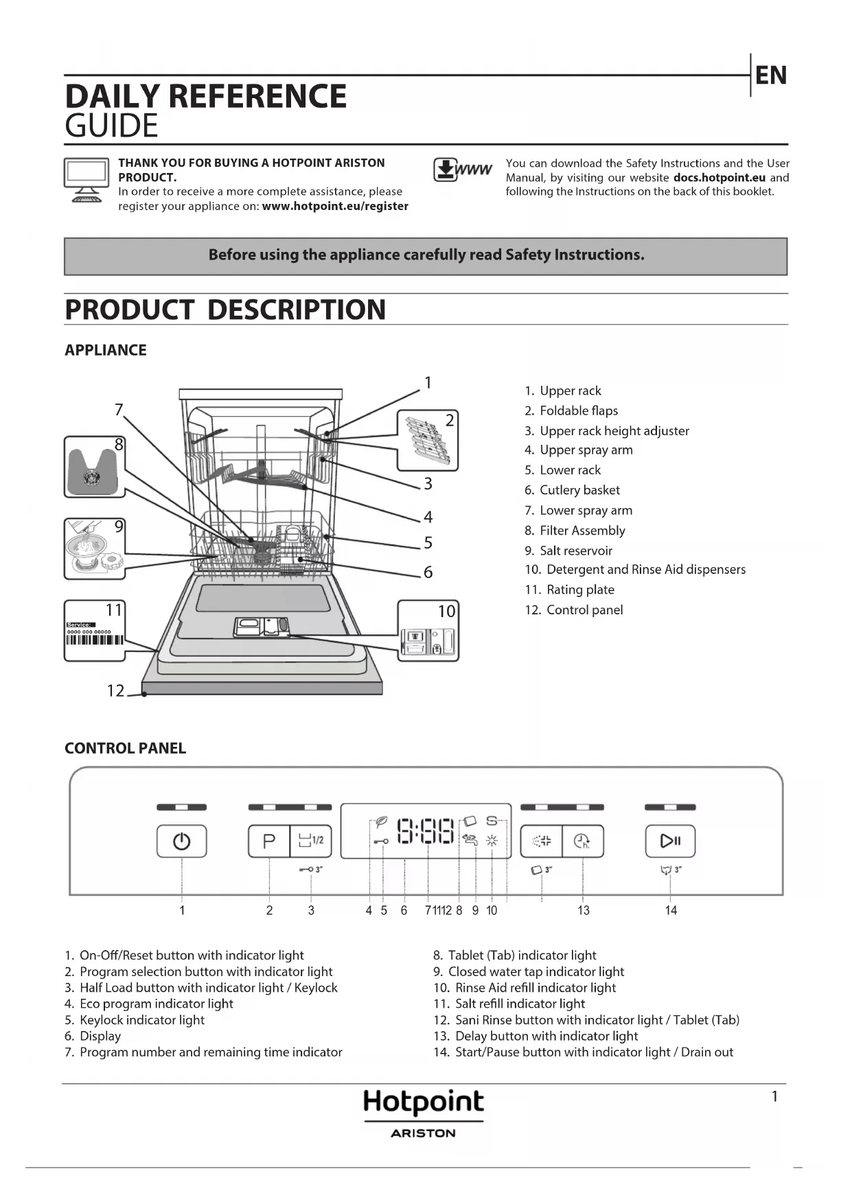 MERCI D’AVOIR CHOISI UN PRODUIT HOTPOINT ARISTON. An de recevoir une assistance plus complète, merci d’enre-gistrer votre appareil sur: www.hotpoint.eu/registerVous pouvez télécharger les Consignes de sécurité et le Manuel de l’utilisateur, en visitant notre site Internet docs.hotpoint.eu et en suivant les instructions gurant au verso du présent fascicule. APPAREIL 1. Panier supérieur2. Volets pliables3. Bouton de réglage de la hauteur du panier supérieur4. Bras d’aspersion supérieur5. Panier inférieur6. Panier à couvert7. Bras d’aspersion inférieur8. Ensemble ltre9. Réservoir à sel10. Distributeurs de détergent et liquide de rinçage11. Plaque signalétique12. Panneau de commande0000 000 00000 Service: