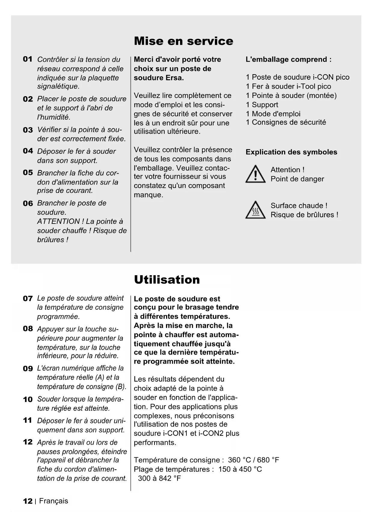 Après le travail ou lors de pauses prolongées, éteindre l'appareil et débrancher la che du cordon d'alimen- tation de la prise de courant. Le poste de soudure est conçu pour le brasage tendre à différentes températures. Après la mise en marche, la pointe à chauffer est automa- tiquement chauffée jusqu'à ce que la dernière températu- re programmée soit atteinte. Les résultats dépendent du choix adapté de la pointe à souder en fonction de l'applica- tion. Pour des applications plus complexes, nous préconisons l'utilisation de nos postes de soudure i-CON1 et i-CON2 plus performants. L'emballage comprend : 1 Poste de soudure i-CON pico 1 Fer à souder i-Tool pico 1 Pointe à souder (montée) 1 Support 1 Mode d'emploi 1 Consignes de sécurité Température de consigne : 360 °C / 680 °F Plage de températures : 150 à 450 °C 300 à 842 °FFrançais