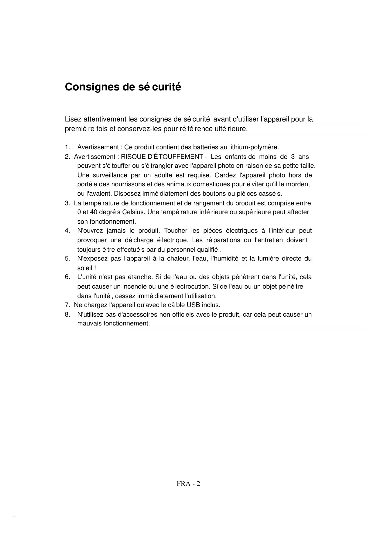 peuvent s'étouffer ou s'étrangler avec l'appareil photo en raison de sa petite taille. Une surveillance par un adulte est requise. Gardez l'appareil photo hors de portée des nourrissons et des animaux domestiques pour éviter qu'il le mordent ou l'avalent. Disposez immédiatement des boutons ou pièces cassés.