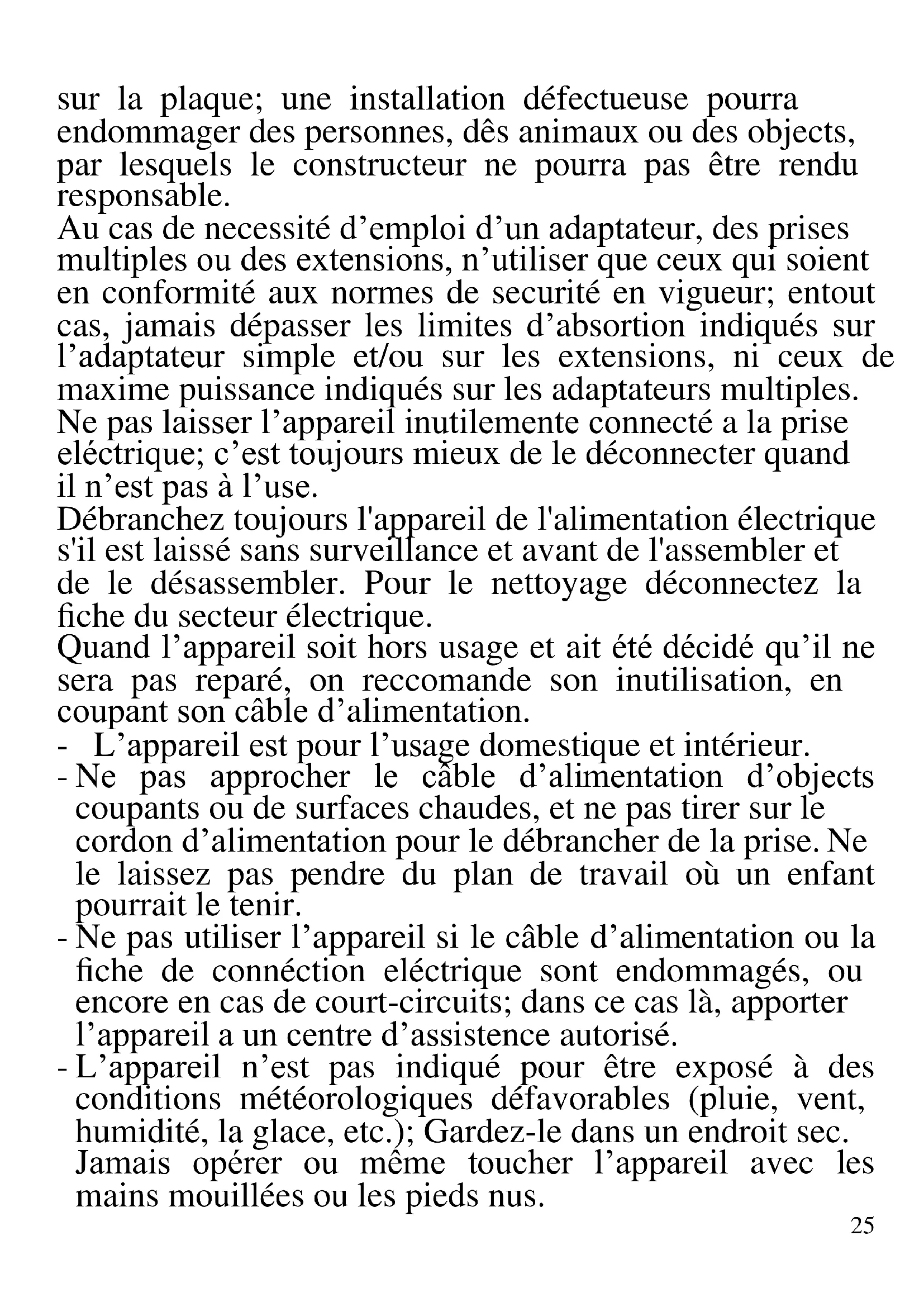 FRANCAIS: ADVERTISSEMENT Les indications suivantes sont très importantes en ce qui concerne l’installation, usage et manutention de cet appareil; gardez soigneusement ce manuel pour des futures consultations; n’utilisez pas l’appareil que selon les indications de ce manuel d’instructions; n’importe quel autre type d’ utilisation devra être consideré inaproprié et potentiellement dangereux; pour cette raison le constructeur ne pourra pas être rendu responsable si des dommages résultants de l’utilisation inapropriée ou irresponsable de l’appareil se produisent. Avant de l’utilisation, certifiez-vous de l’integrité de l’appareil; en cas de doute ne l’utilisez pas et addressez- vous a l’assistence téchnique autoriséa; ne laissez pas des parties de l’emballage (sacs de plastique, polystirène, ongles, agrafages, etc.) à la portée des enfants, car elles constituent des potentielles sources de danger; en autre, il faut rappeler que ces parties doivent être objet de collècte differencié de résidus. Certifiez-vous que les donnés constants de la plaque sont compatibles avec ceux du réseau eléctrique; l’installation doit être efectuée selon les instructions du constructeur, considérant la maxime puissance de l’appareil indiquée25 sur la plaque; une installation défectueuse pourra endommager des personnes, dês animaux ou des objects, par lesquels le constructeur ne pourra pas être rendu responsable. Au cas de necessité d’emploi d’un adaptateur, des prises multiples ou des extensions, n’utiliser que ceux qui soient en conformité aux normes de securité en vigueur; entout cas, jamais dépasser les limites d’absortion indiqués sur l’adaptateur simple et/ou sur les extensions, ni ceux de maxime puissance indiqués sur les adaptateurs multiples. Ne pas laisser l’appareil inutilemente connecté a la prise eléctrique; c’est toujours mieux de le déconnecter quand il n’est pas à l’use. Débranchez toujours l'appareil de l'alimentation électrique s'il est laissé sans surveillance et avant de l'assembler et de le désassembler. Pour le nettoyage déconnectez la fiche du secteur électrique. Quand l’appareil soit hors usage et ait été décidé qu’il ne sera pas reparé, on reccomande son inutilisation, en coupant son câble d’alimentation. - L’appareil est pour l’usage domestique et intérieur. - Ne pas approcher le câble d’alimentation d’objects coupants ou de surfaces chaudes, et ne pas tirer sur le cordon d’alimentation pour le débrancher de la prise. Ne le laissez pas pendre du plan de travail où un enfant pourrait le tenir. - Ne pas utiliser l’appareil si le câble d’alimentation ou la fiche de connéction eléctrique sont endommagés, ou encore en cas de court-circuits; dans ce cas là, apporter l’appareil a un centre d’assistence autorisé. - L’appareil n’est pas indiqué pour être exposé à des conditions météorologiques défavorables (pluie, vent, humidité, la glace, etc.); Gardez-le dans un endroit sec. Jamais opérer ou même toucher l’appareil avec les mains mouillées ou les pieds nus.26 - Ce produit ne doit pas être utilisé par les enfants, même s'ils ont plus de 8 ans. - Cet appareil peut être utilisé par des personnes ayant des capacités physiques, sensorielles ou mentales réduites, ou qui manquent d'expérience ou de connaissances, si elles ont été correctement supervisées ou ont reçu des instructions pour utiliser cet appareil en toute sécurité. - Les enfants ne doivent pas jouer avec cet appareil. - Gardez l’appareil et le câble d’alimentation hors la portée des enfants agés de moins de 8 ans. Au cas de panne et/ou de mauvais fonctionnement, ne pas intervenir sur l’ appareil. Pour une éventuel réparation s’addresser uniquement a un centre autorisé par le constructeur, en demandant dês pièces de remplacement originaux. Le non respect de ces indications peut compromettre la securité de l’appareil e rendre invalides les termes de la garantie. ATTENTION: Cet appareil comporte une fonction de chauffage. Quelques surfaces, même si non la plaque elle même, pourront atteindre des températures élevées. Étant donné que la sensibilité à la température diffère de personne à personne, cet appareil devrà être usé avec PRUDENCE. Placez l’appareil sur des surfaces adéhrentes et préparées pour cet effet, et utilisez les mésures de protection contre la chaleur conseillées, comme dês poignées ou des gants de cuisine. - Cet appareil est destiné à être utilisé dans les ménages et des applications similaires: les cuisines du personnel dans les magasins, bureaux et autres environnements de travail, pour les clients dans les hôtels, motels et autres environnements de type résidentiel, de type lit et petit- déjeuner, hébergement. - L’appareil n’est pas conçu pour être utilisé avec une minuterie extérieure ou un commande à distance. - N’utiliser que des accéssoires e pièces d’origine.27 - Avant chaque utilisation, effectuez le cordon d'alimentation. Ne soumettez pas le produit à des chocs susceptibles de l'endommager. N’utilisez pas l’appareil dans des lieux contenant des explosifs, des gaz combustibles ou des liquides inflammables (peintures, colles, etc.).