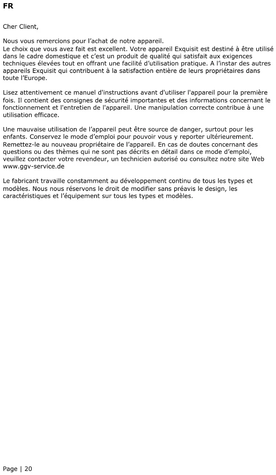 - If an appliance is repaired, the repair invoices are payable immediately without deduction.FR Page | 20 Cher Client, Nous vous remercions pour l’achat de notre appareil. Le choix que vous avez fait est excellent. Votre appareil Exquisit est destiné à être utilisé dans le cadre domestique et c’est un produit de qualité qui satisfait aux exigences techniques élevées tout en offrant une facilité d’utilisation pratique. A l’instar des autres appareils Exquisit qui contribuent à la satisfaction entière de leurs propriétaires dans toute l’Europe. Lisez attentivement ce manuel d'instructions avant d'utiliser l'appareil pour la première fois. Il contient des consignes de sécurité importantes et des informations concernant le fonctionnement et l'entretien de l'appareil. Une manipulation correcte contribue à une utilisation efficace. Une mauvaise utilisation de l’appareil peut être source de danger, surtout pour les enfants. Conservez le mode d’emploi pour pouvoir vous y reporter ultérieurement. Remettez-le au nouveau propriétaire de l’appareil. En cas de doutes concernant des questions ou des thèmes qui ne sont pas décrits en détail dans ce mode d’emploi, veuillez contacter votre revendeur, un technicien autorisé ou consultez notre site Web www.ggv-service.de Le fabricant travaille constamment au développement continu de tous les types et modèles. Nous nous réservons le droit de modifier sans préavis le design, les caractéristiques et l’équipement sur tous les types et modèles.FR Page | 21 13 Sécurité