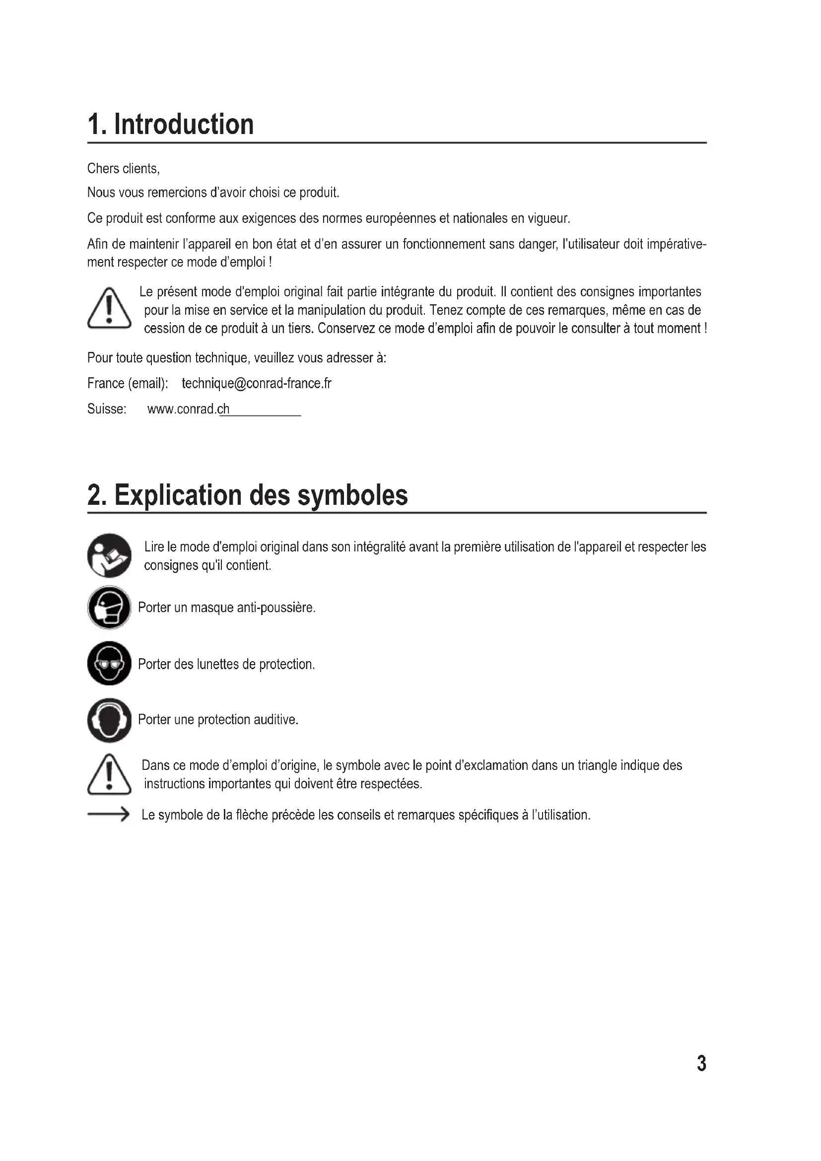 Chersclients, Nousvousremercionsd’avoirchoisiceproduit. Ce produit est conforme aux exigences des normes européennes et nationales en vigueur. Andemaintenirl’appareilenbonétatetd’enassurerunfonctionnementsansdanger,l’utilisateurdoitimpérative- ment respecter ce mode d’emploi ! Le présent mode d'emploi original fait partie intégrante du produit. Il contient des consignes importantes pourlamiseenserviceetlamanipulationduproduit.Tenezcomptedecesremarques,mêmeencasde cessiondeceproduitàuntiers.Conservezcemoded’emploiandepouvoirleconsulteràtoutmoment! Pourtoutequestiontechnique,veuillezvousadresserà: France(email): technique@conrad-france.fr Suisse: www.conrad.ch