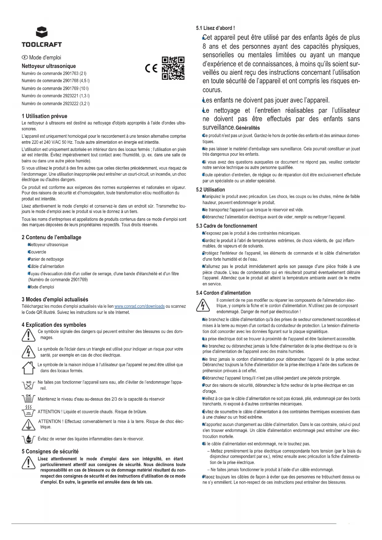 Operating voltage 220 – 240 V/AC 50 Hz Power consumption (W) 160 380 440 160 280 Fuse (glass tube 5 x 20 mm) F10 A/250 V Ultrasonic power (W) 60 180 240 60 180 Ultrasonic frequency (kHz) 40 Heating power (W) 100 200 200 100 100 Timer (min) 0 - 30 Temperature setting (°C) 30 - 80 Tank capacity (l) 2 4.5 10 1.3 3.2 Tank dimensions (mm) 150 x 135 x 100 300 x 150 x 100 300 x 240 x 150 150 x 135 x 65 240 x 135 x 100 Housing dimensions (mm) 175 x 160 x 210 325 x 180 x 225 325 x 265 x 280 172 x 162 x 165 265 x 165 x 220 Weight (kg) 2.4 4.6 7.3 2 3.6Mode d'emploi Nettoyeur ultrasonique Numéro de commande 2901763 (2 l) Numéro de commande 2901768 (4,5 l) Numéro de commande 2901769 (10 l) Numéro de commande 2923221 (1,3 l) Numéro de commande 2923222 (3,2 l) 1 Utilisation prévue Le nettoyeur à ultrasons est destiné au nettoyage d'objets appropriés à l'aide d'ondes ultra- sonores. L’appareil est uniquement homologué pour le raccordement à une tension alternative comprise entre 220 et 240 V/AC 50 Hz. Toute autre alimentation en énergie est interdite. L’utilisation est uniquement autorisée en intérieur dans des locaux fermés ; l’utilisation en plein air est interdite. Évitez impérativement tout contact avec l'humidité, (p. ex. dans une salle de bains ou dans une autre pièce humide). Si vous utilisez le produit à des ns autres que celles décrites précédemment, vous risquez de l’endommager. Une utilisation inappropriée peut entraîner un court-circuit, un incendie, un choc électrique ou d'autres dangers. Ce produit est conforme aux exigences des normes européennes et nationales en vigueur. Pour des raisons de sécurité et d’homologation, toute transformation et/ou modication du produit est interdite. Lisez attentivement le mode d’emploi et conservez-le dans un endroit sûr. Transmettez tou- jours le mode d’emploi avec le produit si vous le donnez à un tiers. Tous les noms d’entreprises et appellations de produits contenus dans ce mode d’emploi sont des marques déposées de leurs propriétaires respectifs. Tous droits réservés. 2 Contenu de l’emballage