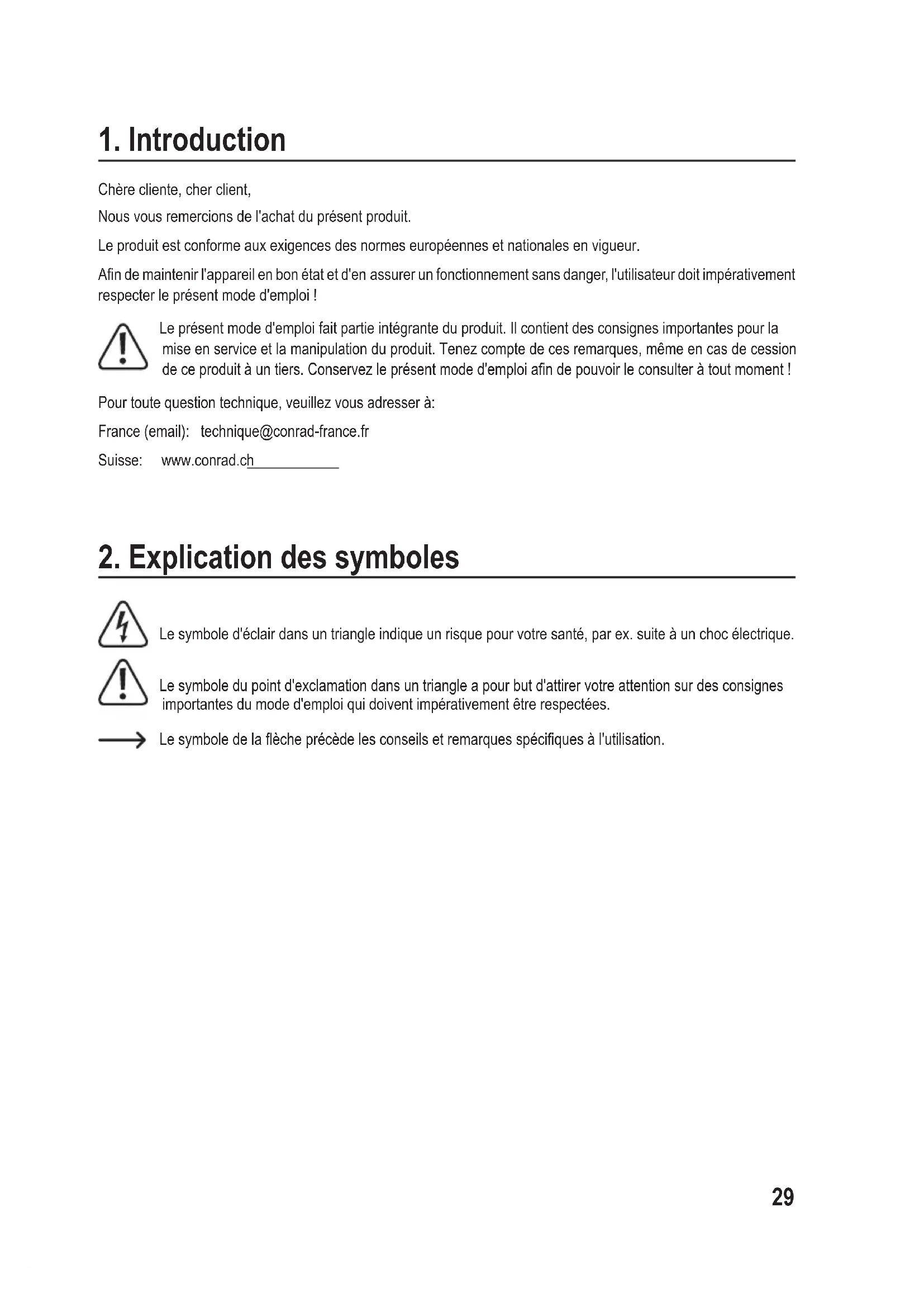Chèrecliente,cherclient, Nousvousremercionsdel'achatduprésentproduit. Le produit est conforme aux exigences des normes européennes et nationales en vigueur. Andemaintenirl'appareilenbonétatetd'enassurerunfonctionnementsansdanger,l'utilisateurdoitimpérativement respecterleprésentmoded'emploi! Leprésentmoded'emploifaitpartieintégranteduproduit.Ilcontientdesconsignesimportantespourla mise en service et la manipulation du produit. Tenez compte de ces remarques, même en cas de cession deceproduitàuntiers.Conservezleprésentmoded'emploiandepouvoirleconsulteràtoutmoment! Pour toute question technique, veuillez vous adresser à: France (email): technique@conrad-france.fr Suisse: www.conrad.ch