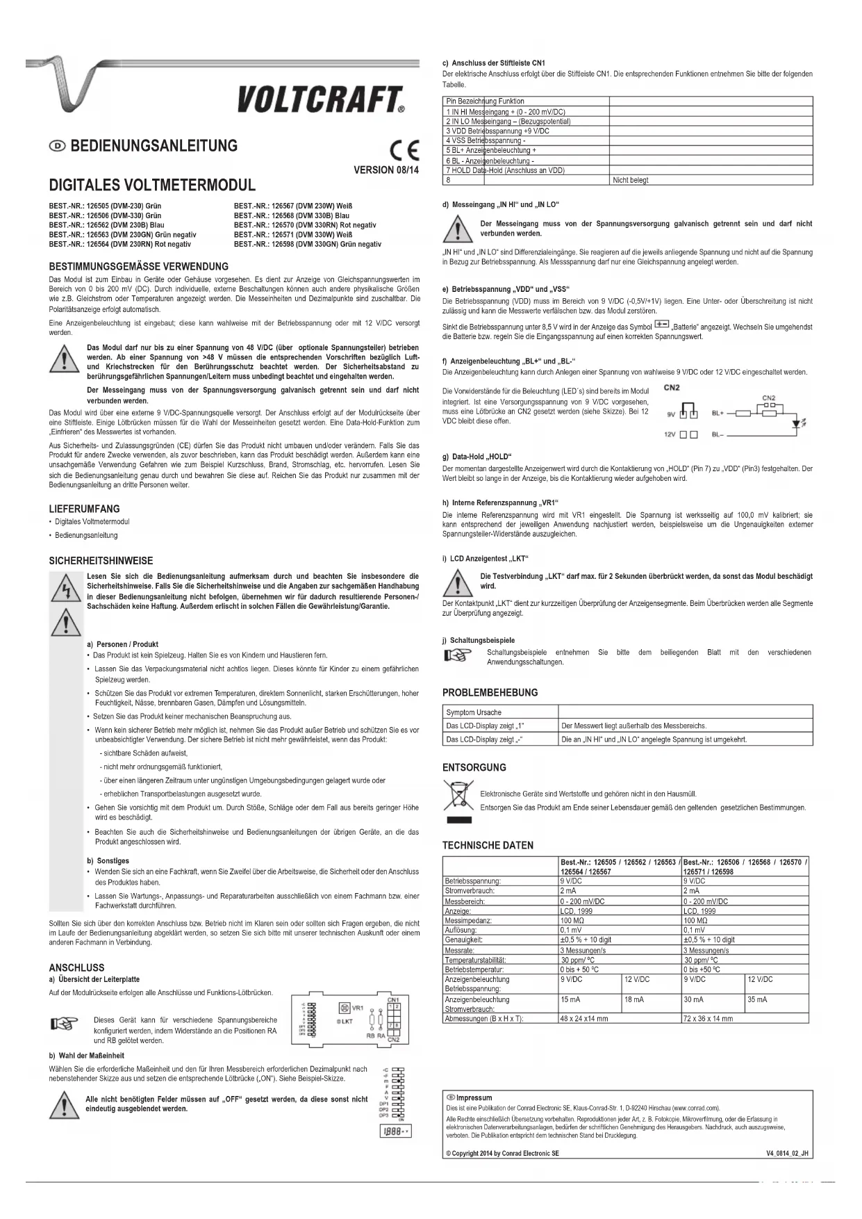 Nº DE COMMANDE : 126505 (DVM-230) Vert Nº DE COMMANDE : 126506 (DVM-330) Vert Nº DE COMMANDE : 126562 (DVM 230B) Bleu Nº DE COMMANDE : 126563 (DVM 230GN) Vert négatif Nº DE COMMANDE : 126564 (DVM 230RN) Rouge négatif Nº DE COMMANDE : 126567 (DVM 230W) Blanc Nº DE COMMANDE : 126568 (DVM 330B) Bleu Nº DE COMMANDE : 126570 (DVM 330RN) Rouge négatif Nº DE COMMANDE : 126571 (DVM 330W) Blanc Nº DE COMMANDE : 126598 (DVM 330GN) Vert négatif UTILISATION PREVUE Le module est prévu pour le montage dans un appareil ou dans un boîtier. Il sert à l’afchage des valeurs de tension continue comprises entre 0 et 200 mV (CC). Vous pouvez faire afcher d’autres grandeurs physiques, comme p. ex. celles du courant continu ou des températures, au moyen de câblages individuels externes. Les unités de mesure et le signe décimal peuvent être affectés. L’afchage de la polarité s’effectue automatiquement. L’éclairage de l’afchage est inclus, il peut être alimenté soit par la tension de service soit par 12 V/CC. Le module ne doit être utilisé que jusqu’à une tension de 48 V/CC (au moyen dediviseurs de tension, en option). À partir d’une tension de >48 V il faut respecter lesprescriptions respectives sur les lignes de fuite et les distances d’isolement pour la-protectioncontre le contact. La distance de sécurité par rapport aux tensions/conducteurs comportant des risques au contact doit impérativement être respectée. L’entrée de mesure doit être séparée galvaniquement de l’alimentation en tension et ne doit pas y être raccordée. Le module est alimenté par une source électrique externe de 9 V/CC. Le raccordement se fait par l’intermédiaire d’une barrette à broches sur l’arrière du module. Il faut placerquelques ponts de soudure pour le choix des unités de mesures. Il y a une fonction « data hold » pour « geler »la valeur de mesure. Pour des raisons de sécurité et d’homologation (CE), toute transformation et/ou modication du produit est interdite. Si vous utilisez le produit à d’autres ns que celles décrites précédemment, cela risque d’endommager le produit. Par ailleurs, une utilisation incorrecte peut être source de dangers tels que court-circuit, incendie, électrocution. Lisez attentivement le mode d’emploi et conservez le. Ne transmettez le produit à des tiers qu’accompagné de son mode d’emploi.
