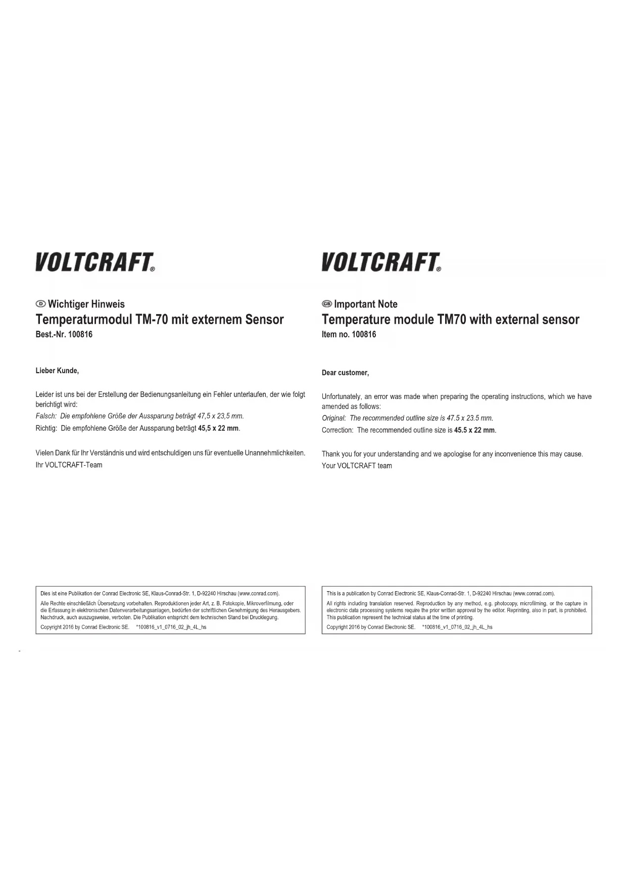 - Les changements rapides de température sont de nature à endommager l’appareil. Entretien et nettoyage Ne nettoyez l’appareil qu’avec un tissu antistatique humide. N’utilisez pas de produits abrasifs ou diluants. Elimination des déchets a) Produit Les appareils électroniques sont des matériaux recyclables et ne doivent pas être éliminés avec les ordures ménagères. En n de vie, éliminez l'appareil conformément aux dispositions légales en vigueur. Retirez les piles/accumulateurs insérées et éliminez-les séparément du produit. b) Piles / Accumulateurs Le consommateur nal est légalement tenu (ordonnance relative à l´élimination des piles usagées) de rapporter toutes les piles et batteries usagées, il est interdit de les jeter dans les ordures ménagères. Les piles/accumulateurs qui contiennent des substances toxiques sont caractérisées par les symboles ci-contre qui indiquent l'interdiction de les jeter dans les ordures ménagères. Les désignations pour le métal lourd prépondérant sont : Cd = cadmium, Hg = mercure, Pb = plomb (la désignation se trouve sur les piles/accumulateurs, par ex. sous le symbole de la poubelle illustré à gauche). Vous pouvez rapporter gratuitement vos piles/accumulateurs usagées aux centres de récupération de votre commune, à nos succursales ou à tous les points de vente de piles/accumulateurs. Vous respectez ainsi les ordonnances légales et contribuez à la protection de l'environnement. Caractéristiques techniques Tension de service .......................................................... 1 pile bouton CX927 de 1,5 V/DC Consommation ...............................................................8μA Température de fonctionnement (module avec LCD) ..... de 0 à 50 °C Gamme de mesure de température (capteur) ................ de -50 à 70 °C Résolution ....................................................................... 0,1 °C (au-dessus de -20 °C) 0,1 °C (en dessous de -20 °C) Intervalle de mesure ....................................................... 10 secondes Conditions de fonctionnement/rangement ...................... Module : de 0 à 50 °C (module), <80 % d’humidité relative (sans condensation) Capteur : de -50 à 70 °C (capteur), <80 % d’humidité relative (sans condensation) Dimensions (L x H x P) ................................................... 48 x 24 x 15.5 mm Poids ...............................................................................env. 30 g Mode d'emploi Module de température TM70 avec capteur externe Nº de commande 100816 Utilisation prévue Le « Module de température TM70 avec capteur externe » est un appareil de mesure de la température conçu pour être monté dans d’autres appareils, panneaux de contrôle, etc. Ce produit ne peut fonctionner qu’avec des piles boutons de type CX927. Le module ne doit être utilisé que s’il est monté dans un boîtier, un panneau de contrôle, une console ou objets similaires. Le module est exclusivement conçu pour une utilisation en intérieur, et la sonde pour une utilisation en extérieur. Tout contact avec l’humidité doit impérativement être évité. Ce module est un composant « non testé CE » et est conçu pour être monté dans un appareil ou un boîtier. Son application doit s’effectuer de manière conforme aux normes CE. Pour des raisons de sécurité, toute transformation et/ou modication du produit est interdite. Si vous utilisez le produit à d'autres ns que celles décrites précédemment, cela risque d'endommager le produit. Par ailleurs, une utilisation incorrecte peut être source de dangers tels que court-circuit, incendie etc. Lisez attentivement le mode d'emploi et conservez le. Ne transmettez le produit à des tiers qu'accompagné de son mode d'emploi. Le produit est conforme aux exigences des directives européennes et nationales en vigueur. Tous les noms d'entreprises et appellations de produits contenus dans ce mode d'emploi sont des marques déposées des propriétaires correspondants. Tous droits réservés. Contenu d'emballage