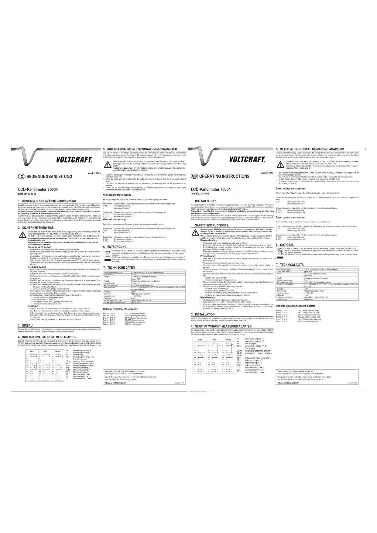 - V + Tension de service pôle positif + 8 V - Tension de service pôle négatif - ELIMINATION DES DÉCHETS6. An de préserver, protéger et améliorer la qualité de l’environnement, ainsi que de protéger la santé des êtres humains et d’utiliser prudemment les ressources naturelles, il est demandé à l’utilisateur de rapporter les appareils à mettre au rebut aux points de collecte et de recyclage appropriés en conformité avec les règlements d’application. Le logo représentant une poubelle à roulettes barrée d’une croix signie que ce produit doit être apporté à un point de collecte et de recyclage des produits électroniques pour que ses matières premières soient recyclées au mieux. CARACTÉRISTIQUES TECHNIQUES7. Alimentation en tension continue : 9V ou 5V ou +/-5V (8 à 30V avec adaptateur de mesure) Consommation de courant : env. 3 mA Ecran : à 3 ½ caractères LCD, (afcheur à cristaux liquides) Afchage 1999 Polarité : Signe automatique en cas d’entrée négative Afchage de dépassement : „1” ou „-1” Tension de mesure maxi : 199,9 mV DC (sans adaptateur de mesure) Exactitude de mesure : +/- (0,1% +2 digits) pour +23 °C (+/- 5 °C) et une humidité relative de l’air de <80%, non condensante Résolution : 0,1 mV Cadence d’acquisition : 2-3 mesures par seconde Résistance interne : >/= 1000 MOhm Hauteur des chiffres: 14 mm Dimensions du boîtier avant : 62mm x 26mm x 19mm ( L x H x P ) Dimensions de l‘ouverture d‘emplacement : 60mm x 24mm Adaptateurs de mesure en vente optionnelle N° de commande 12 07 60 Plage de mesure de la tension de 2V DC N° de commande 12 07 61 Plage de mesure de la tension de 20V DC N° de commande 12 07 62 Plage de mesure de la tension de 200V DC N° de commande 12 08 01 Plage de mesure du courant de 20mA DC N° de commande 12 08 03 Plage de mesure du courant de 200mA DC N° de commande 12 08 05 Plage de mesure du courant de 2A DC Deze gebruiksaanwijzing is een publicatie van Voltcraft p. 30