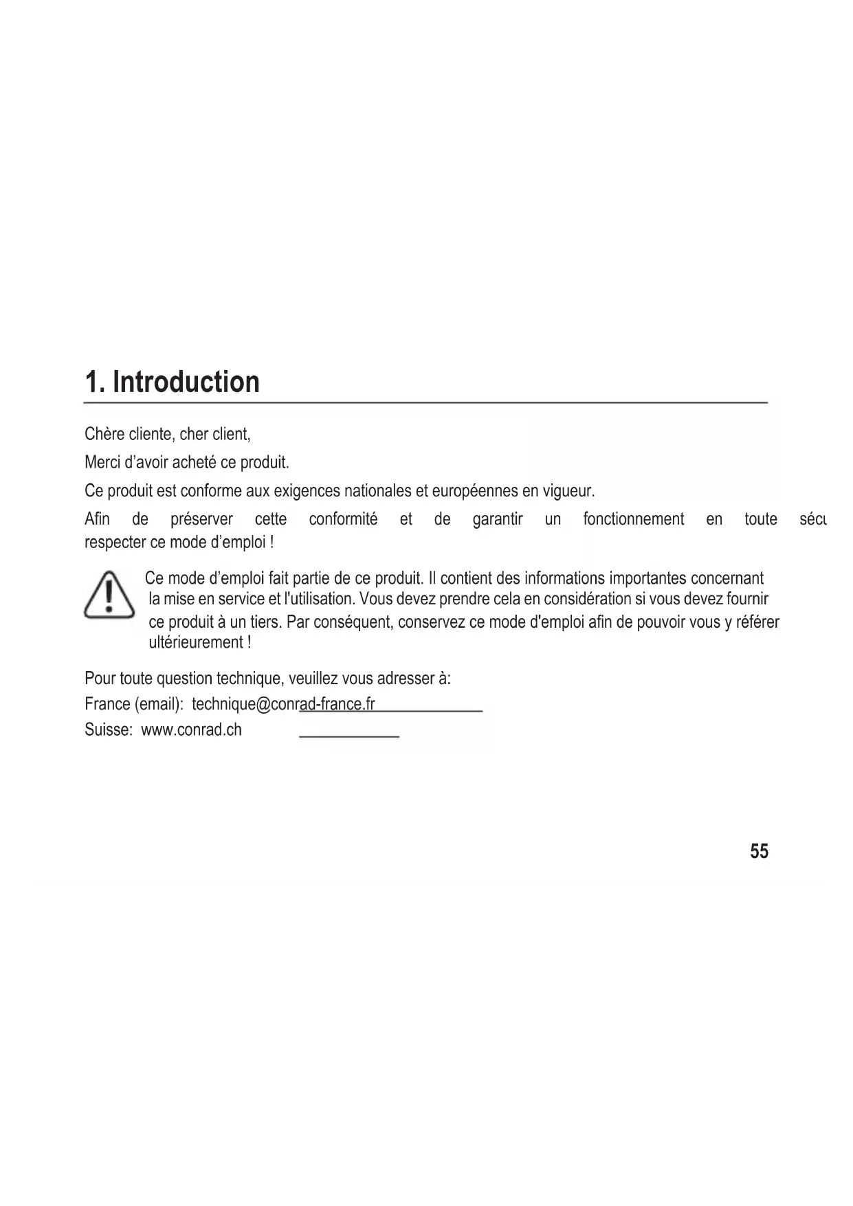 Chère cliente, cher client, Merci d’avoir acheté ce produit. Ceproduitestconformeauxexigencesnationaleseteuropéennesenvigueur. An de préserver cette conformité et de garantir un fonctionnement en toute sécurité, vous devez respecter ce mode d’emploi ! Ce mode d’emploi fait partie de ce produit. Il contient des informations importantes concernant la mise en service et l'utilisation. Vous devez prendre cela en considération si vous devez fournir ceproduitàuntiers.Parconséquent,conservezcemoded'emploiandepouvoirvousyréférer ultérieurement ! Pourtoutequestiontechnique,veuillezvousadresserà: France (email): technique@conrad-france.fr Suisse: www.conrad.ch