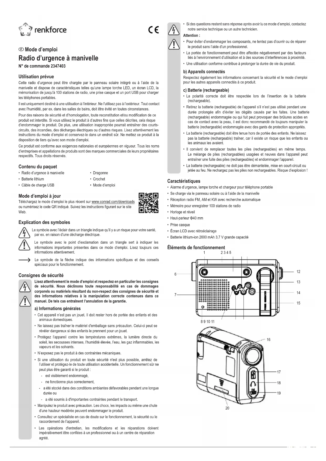 Mode d’emploi Radio d’urgence à manivelle N° de commande 2347403 Utilisation prévue Cette radio d’urgence peut être chargée par le panneau solaire intégré ou à l’aide de la manivelle et dispose de caractéristiques telles qu’une lampe torche LED, un écran LCD, la mémorisation de jusqu'à 100 stations de radio, une prise casque et un port USB pour charger les téléphones portables. Il est uniquement destiné à une utilisation à l’intérieur. Ne l'utilisez pas à l’extérieur. Tout contact avec l'humidité, par ex. dans les salles de bains, doit être évité en toutes circonstances. Pour des raisons de sécurité et d’homologation, toute reconstitution et/ou modication de ce produit est interdite. Si vous utilisez le produit à d’autres ns que celles décrites, cela risque d’endommager le produit. De plus, une utilisation inappropriée pourrait entraîner des courts- circuits, des incendies, des décharges électriques ou d’autres risques. Lisez attentivement les instructions du mode d’emploi et conservez-le dans un endroit sûr. Ne mettez ce produit à la disposition de tiers qu’avec son mode d’emploi. Ce produit est conforme aux exigences nationales et européennes en vigueur. Tous les noms d’entreprises et appellations de produits sont des marques commerciales de leurs propriétaires respectifs. Tous droits réservés. Contenu du paquet