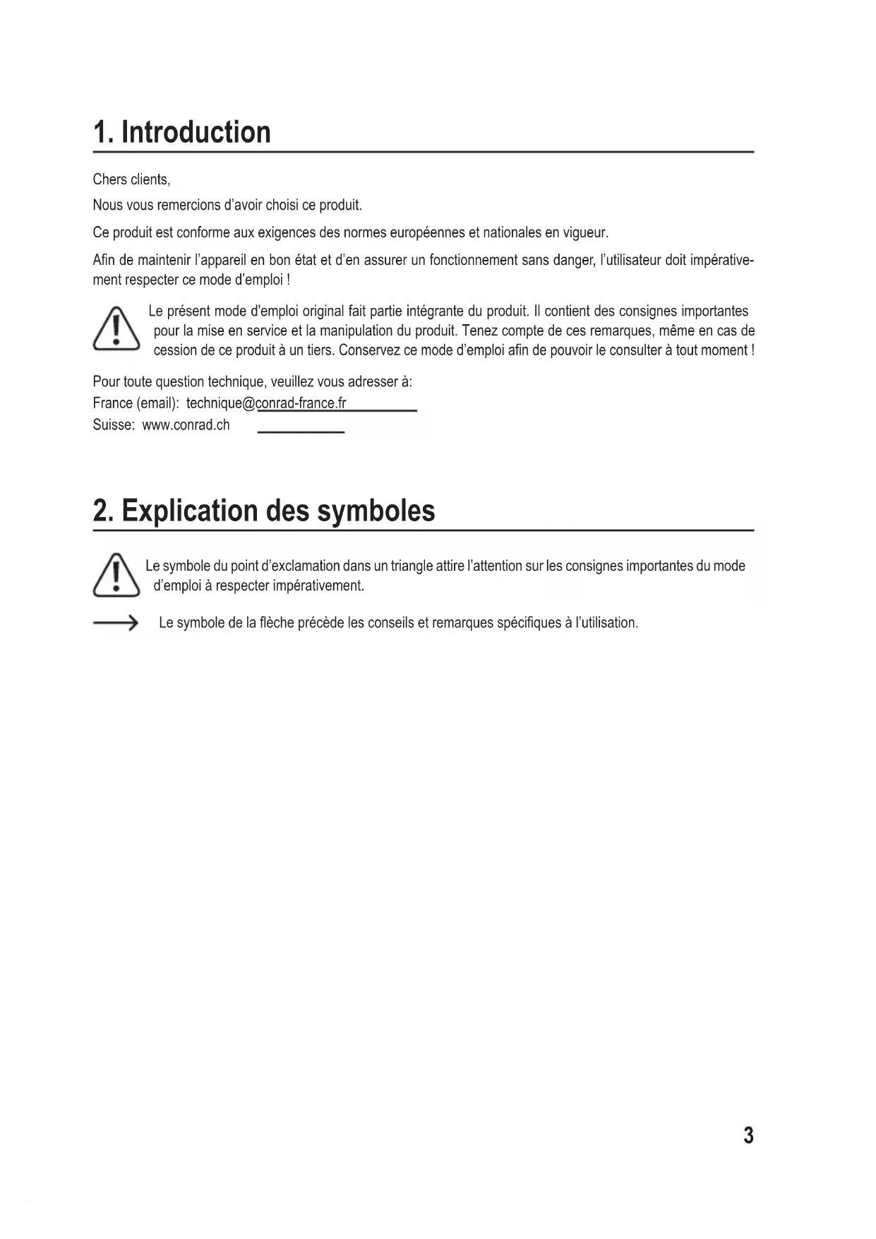 Chers clients, Nous vous remercions d’avoir choisi ce produit. Ce produit est conforme aux exigences des normes européennes et nationales en vigueur. Andemaintenirl’appareilenbonétatetd’enassurerunfonctionnementsansdanger,l’utilisateurdoitimpérative- ment respecter ce mode d’emploi ! Le présent mode d'emploi original fait partie intégrante du produit. Il contient des consignes importantes pour la mise en service et la manipulation du produit. Tenez compte de ces remarques, même en cas de cessiondeceproduitàuntiers.Conservezcemoded’emploiandepouvoirleconsulteràtoutmoment! Pour toute question technique, veuillez vous adresser à: France (email): technique@conrad-france.fr Suisse: www.conrad.ch