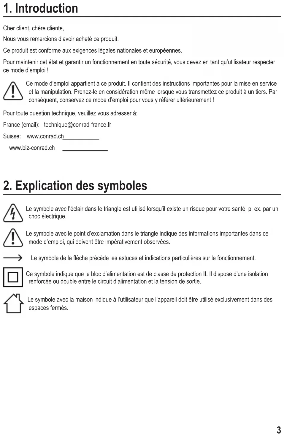 Cher client, chère cliente, Nous vous remercions d’avoir acheté ce produit. Ce produit est conforme aux exigences légales nationales et européennes. Pour maintenir cet état et garantir un fonctionnement en toute sécurité, vous devez en tant qu’utilisateur respecter ce mode d’emploi ! Ce mode d’emploi appartient à ce produit. Il contient des instructions importantes pour la mise en service et la manipulation. Prenez-le en considération même lorsque vous transmettez ce produit à un tiers. Par conséquent, conservez ce mode d’emploi pour vous y référer ultérieurement ! Pour toute question technique, veuillez vous adresser à: France (email): technique@conrad-france.fr Suisse: www.conrad.ch www.biz-conrad.ch
